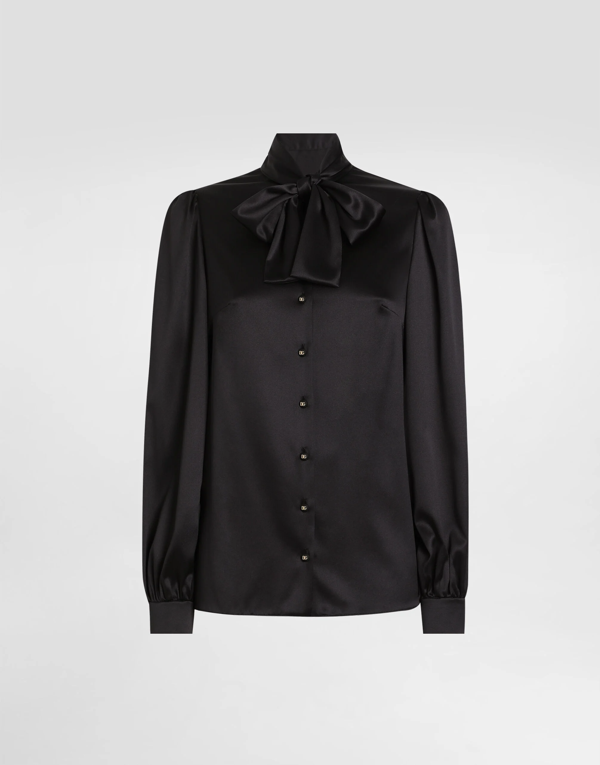 The Women's Black Sicily Collection reinforces Dolce&Gabbana's iconic fabrics and codes rooted in Italian heritage. Sensual silhouettes, highlighted by floral prints and refined corsetry, evoke an intriguing elegance, while the iconic black lace, satin, and velvet dominate the collection. Denim in various shades of blue introduces a contemporary twist, balancing the classic and modern. Embroidered crosses, medals, and jewelry add a sophisticated touch. Silk satin shirt with pussy-bow: • Black • Pussy-bow neck • Long sleeves • Regular fit • DG-branded button fastenings • The piece measures 68 cm from the rear collar seam on a size IT 40 • The model is 175 cm tall and wears a size IT 40 • Made in Italy External composition: 96% Silk 04% Spandex
