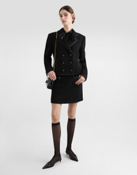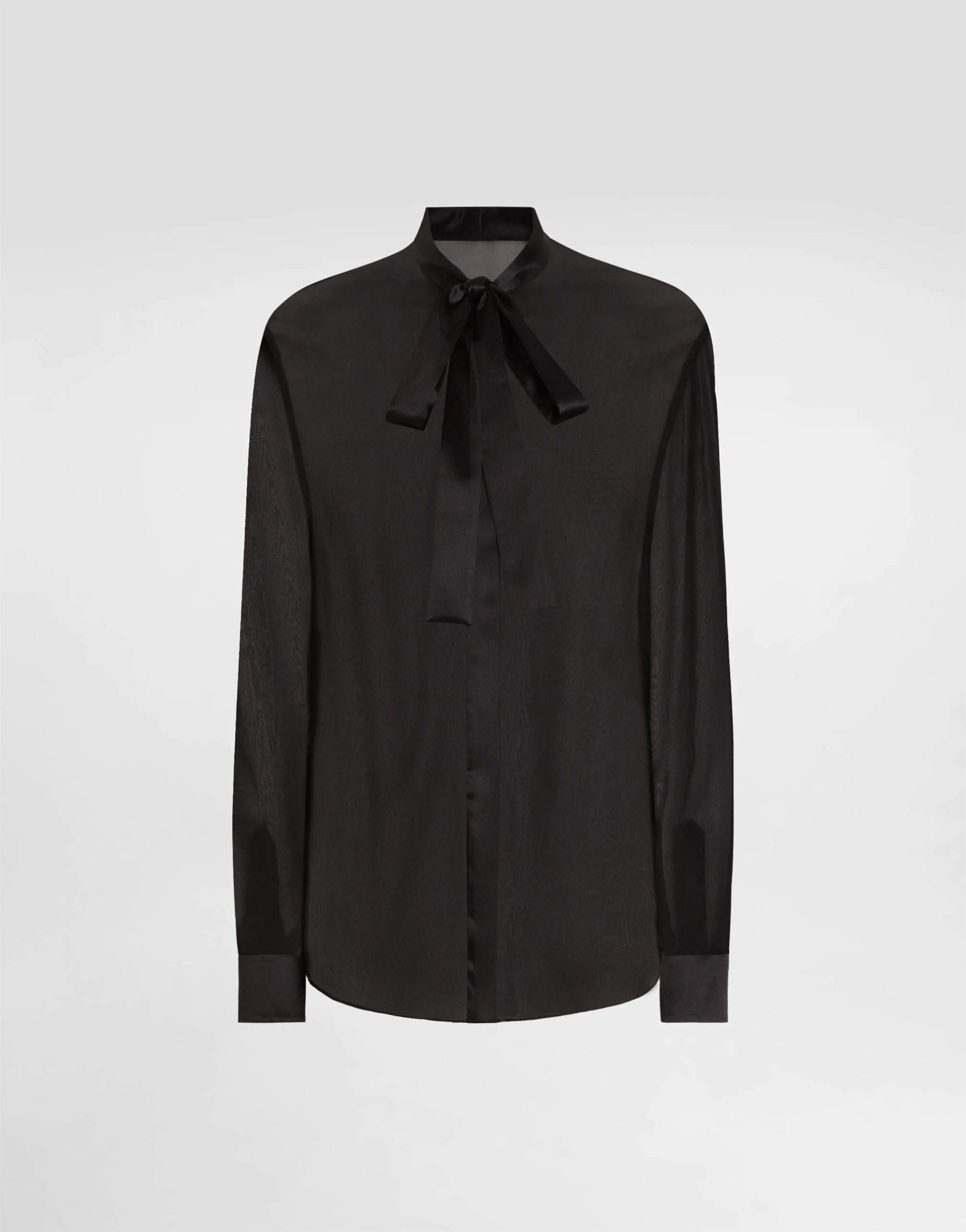 The Women's Black Sicily Collection reinforces Dolce&Gabbana's iconic fabrics and codes rooted in Italian heritage. Sensual silhouettes, highlighted by floral prints and refined corsetry, evoke an intriguing elegance, while the iconic black lace, satin, and velvet dominate the collection. Denim in various shades of blue introduces a contemporary twist, balancing the classic and modern. Embroidered crosses, medals, and jewelry add a sophisticated touch. Silk chiffon pussy-bow shirt: • Black • Round-neck with pussy-bow • Long sleeves • Regular fit • Logo-detailed button fastenings • The piece measures 68 cm from the rear collar seam on a size IT 40 • The model is 175 cm tall and wears a size IT 40 • Made in Italy External composition: 100% Silk