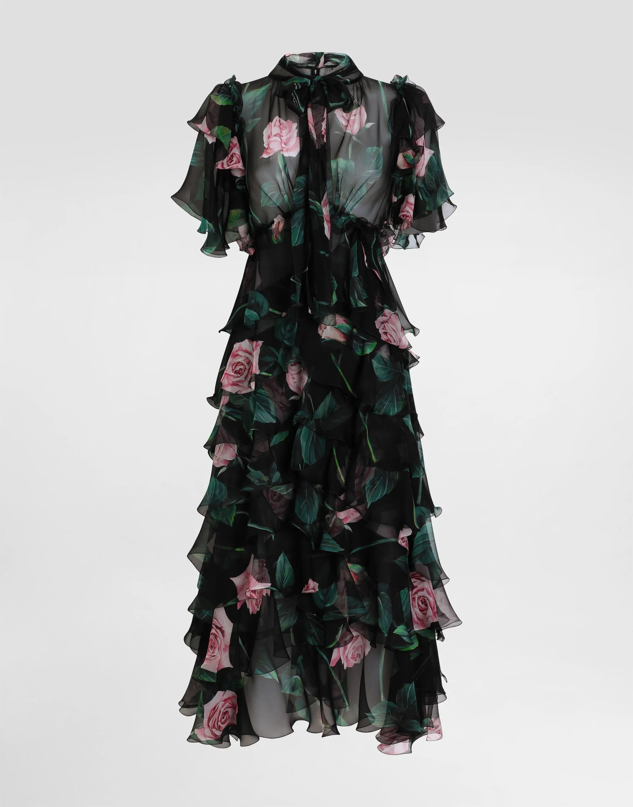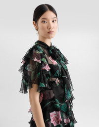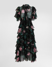 The Women's Black Sicily Collection reinforces Dolce&Gabbana's iconic fabrics and codes rooted in Italian heritage. Sensual silhouettes, highlighted by floral prints and refined corsetry, evoke an intriguing elegance, while the iconic black lace, satin, and velvet dominate the collection. Denim in various shades of blue introduces a contemporary twist, balancing the classic and modern. Embroidered crosses, medals, and jewelry add a sophisticated touch. Rose-print silk chiffon calf-length dress with ruffles and flounces: • Black • Round-neck with pussy-bow • Short sleeves • Unlined • Rear zipper and hook-and-bar fastening • The piece measures 80 cm from the waist down on a size IT 40 • The model is 175 cm tall and wears a size IT 40 • Made in Italy The difference in the print placement that you may find on this product is a feature of Dolce&Gabbana’s “Handmade” pieces. A detail that makes every garment or accessory unique and exclusive. External composition: 100% Silk