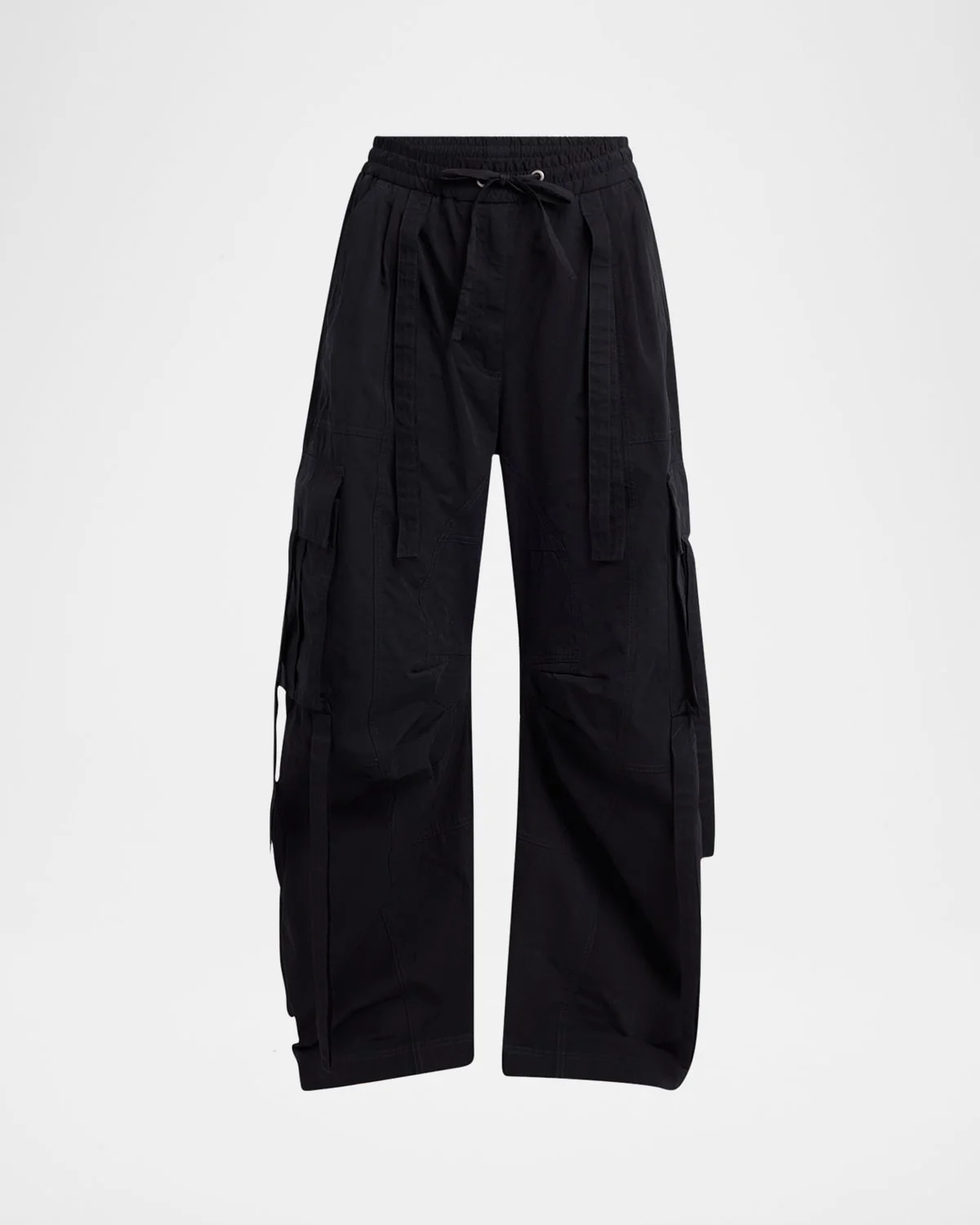 Dolceamp;Gabbana cargo trousers featuring a drawstring waistband, leg flap pockets, and tie details High rise Angled side slip pockets Back zip pockets Wide barrel legs Full length Pullon style Cotton/nylon/polyamide/polyester Made in Italy