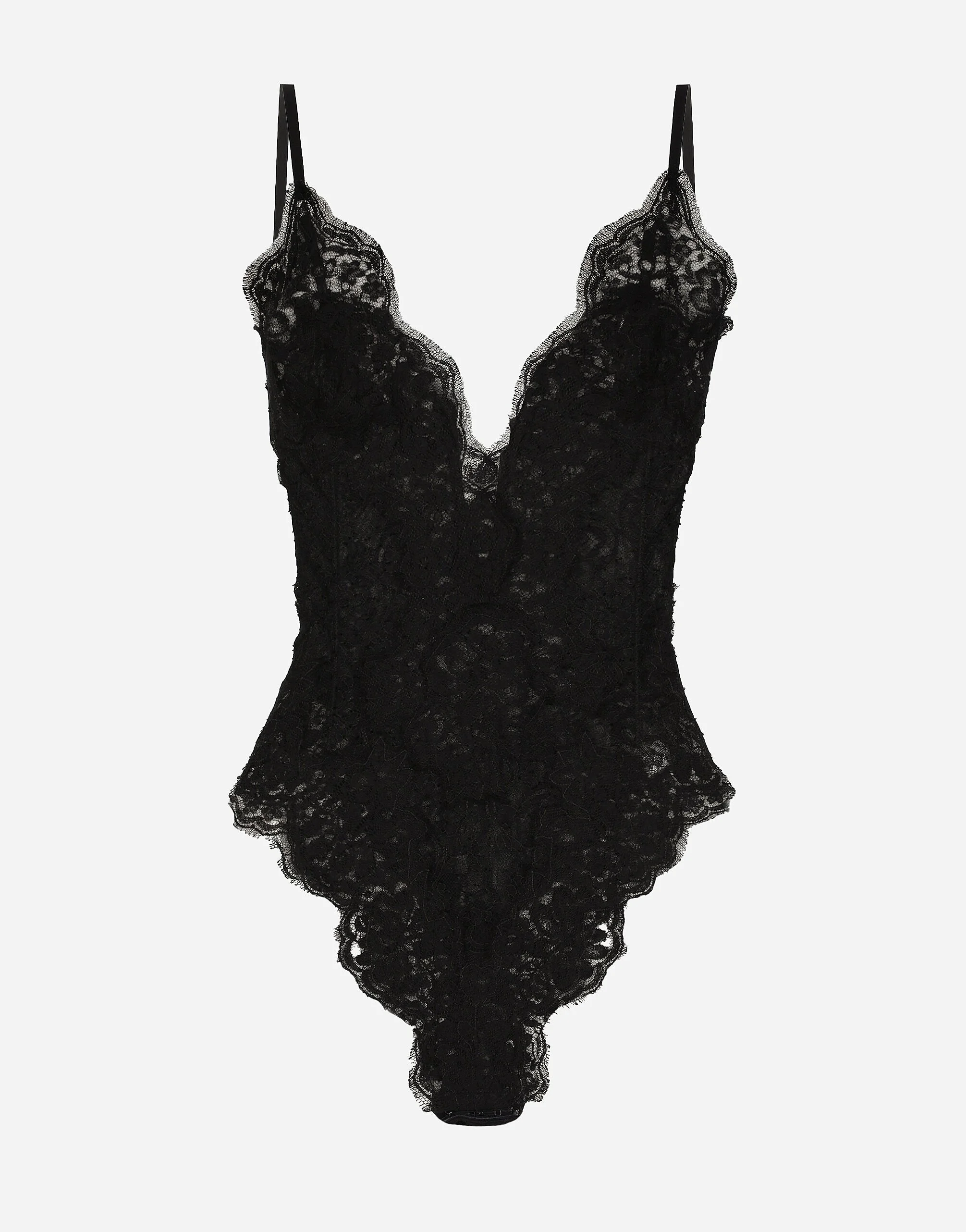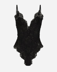 The lingerie collection is a mix of elegant and sensual pieces that flaunt timeless and ageless feminine allure, the distinctive, unmistakable feature of the Dolce&Gabbana woman. Chantilly lace and tulle bodysuit: • Black • Unlined • Soft triangle cups • Adjustable silk straps • Button on the back and hook-and-eye fastenings on the gusset • The model is 175 cm tall and wears a size IT 40 • Made in Italy External composition: 40% Cotton 33% Viscose 20% Polyamide 5% Silk 2% Spandex
