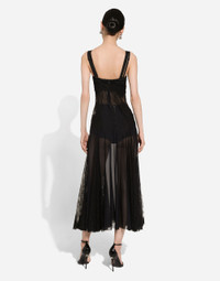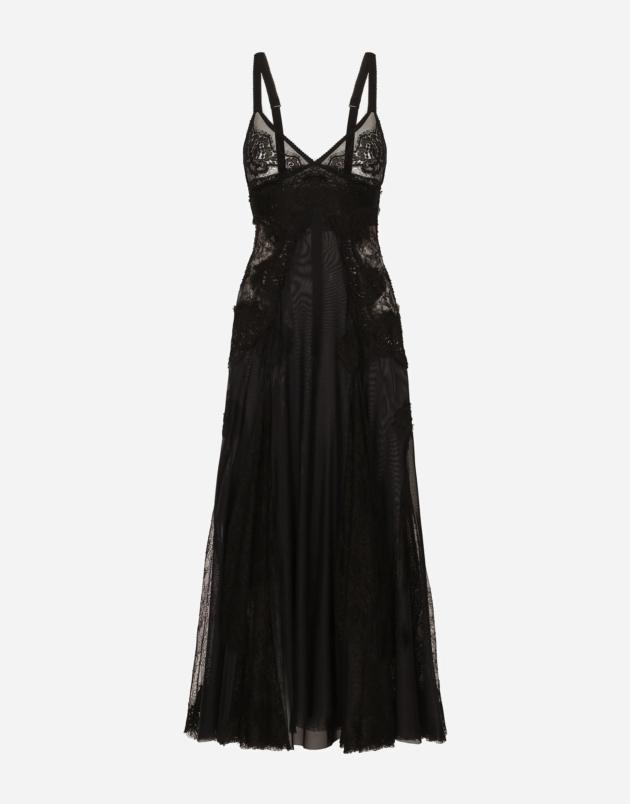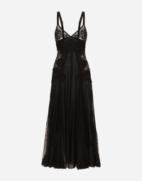 In the Black Sicily Collection, black, the absolute protagonist, becomes sensual black, sheer black, Dolce&Gabbana black. The key concept is “Black on Black”. Playing around with proportions, volumes, layered fabrics and sheer details, this style becomes absolute, bold and sexy. Unique and unmistakable, it is conveyed through the contrasts between glossy and matte fabrics, lines, volumes and special details, thereby expressing a woman’s various personalities and the true identity of Dolce&Gabbana. Stretch tulle midi slip dress with lace inserts: • Black • V-neck • Sleeveless with adjustable stretch straps • Stretch silk crepe de chine slip dress • Invisible zipper and hook-and-eye fastening on the back • The piece measures 90 cm from the waist down on a size IT 40 • The model is 175 cm tall and wears a size IT 40 • Made in Italy External composition: 60% Polyamide 22% Viscose 13% Cotton 5% Spandex Internal composition: 91% Silk 9% Spandex