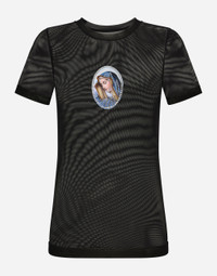 Tulle T-shirt with sacred image patch: • Black • Round neck • Short sleeves • Regular fit • The piece measures 65 cm from the back of the neck on a size IT 40 • The model is 175 cm tall and wears a size IT 40 • Made in Italy Care And Details External composition: 92% Polyamide 8% Spandex