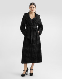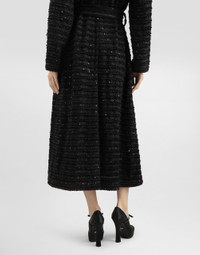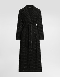 The Spring/Summer 2025 Women’s Collection is celebrating Italian beauty through bold and charismatic femininity. The 50s-inspired lingerie is the star, intermingling with fitted dresses, corsets and oversize trench coats. The iconic jackets have been updated with cropped cuts and modern inserts, while the floral prints add a romantic edge. The eveningwear shines with light fabrics and crystals, accompanied by look-defining accessories, from iconic bags to the cross earrings. Tweed coat with micro-sequin embellishment: • Black • Mirrored lapels • Long sleeves • Side pockets • Tulle lining • Belt fastening • The piece measures 134 cm from the center back on a size IT 40 • The model is 175 cm tall and wears a size IT 40 • Made in Italy External composition: 32% Viscose 25% Polyester 14% Wool 14% Acrylic 10% Cotton 4% Polyamide 1% Other Fibers Internal composition: 100% Polyamide