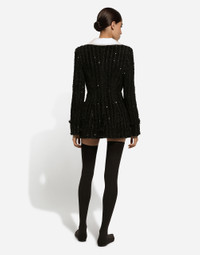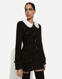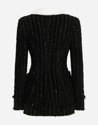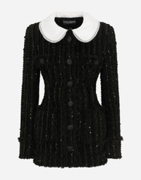In the “WOMAN SS 24” Collection, the imagery of old Sicily interacts with the masculine, with sensual shapes, lace, nude tones and delicate overlays, to create pieces that move amid clean silhouettes, the elegance of the 1960s, the contrasts of black and white and luxurious textures. The designers are reworking their signature style and their iconic Sicilia black color to convey an aware, seductive and confident Sicilian WOMAN who is imbued with sensuality. Tweed jacket with micro-sequin embellishment and a satin collar: • Black • Duchesse baby collar • Single-breasted • Long sleeves • Detachable padded sides • Pockets • Stretch silk satin lining • Press-stud fastenings • The piece measures 71 cm from the center back on a size IT 40 • The model is 175 cm tall and wears a size IT 40 • Made in Italy External composition: 25% Cotton 22% Polyester 21% Viscose 10% Virgin Wool 09% Polyamide 08% Silk 05% Acrylic Internal composition: 90% Polyamide 9% Silk 1% Spandex
