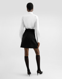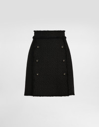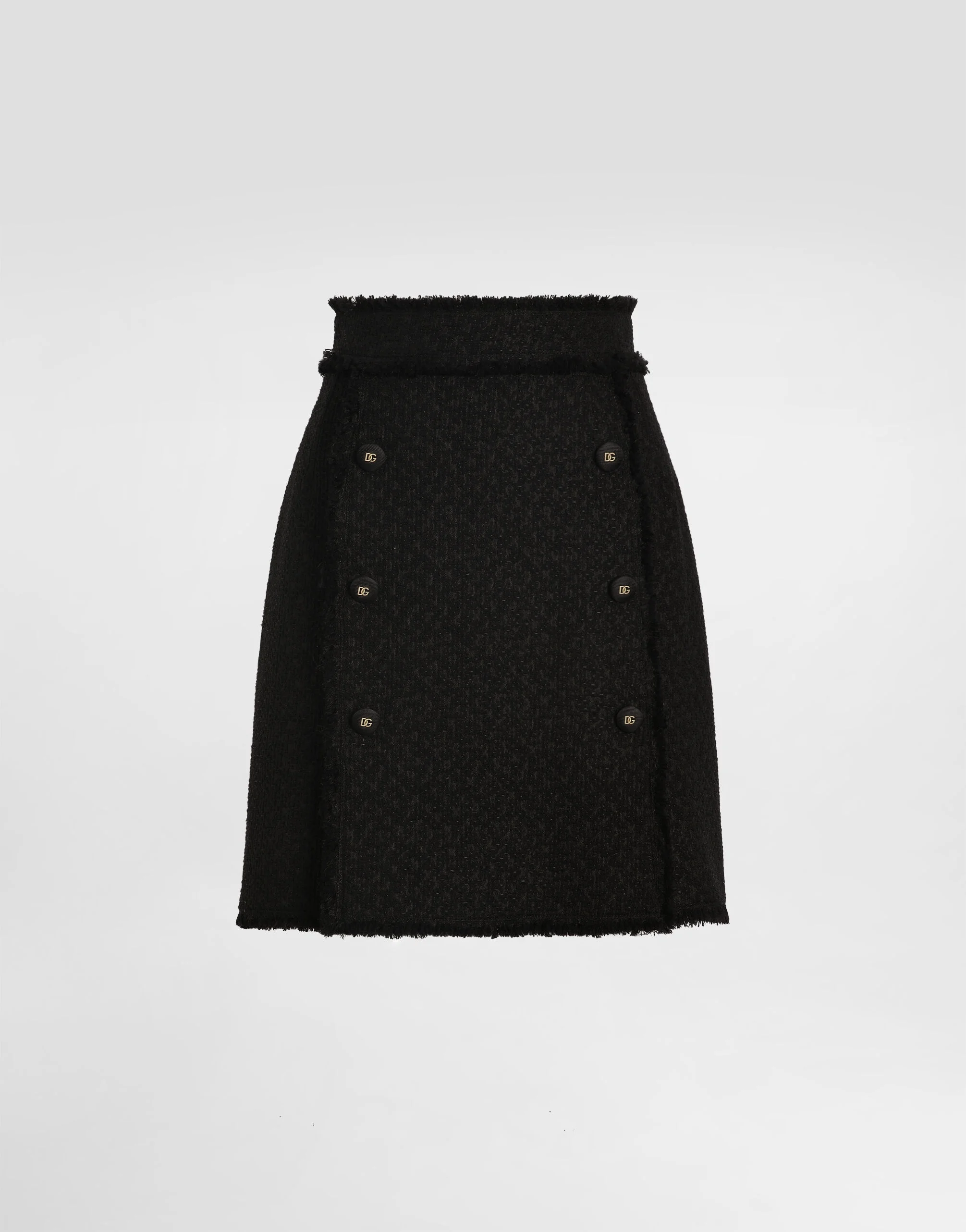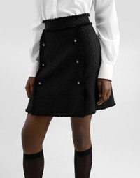 The Women’s DNA Collection is introducing a new side to femininity, which comes in shades of rose quartz, poised between sheerness and opacity, lightness and structure, formality and sensuality. Geometric Dolce Jackets, jacquard pajamas and floral brocade dresses intertwine with ultra-romantic designs. The DG print becomes an iconic statement, while Cordonetto lace and hints of Sicily Black embody the essence of a determined yet romantic femininity. Short wool raschel tweed skirt with decorative DG logo buttons: • Black • High-waisted • Leopard-print stretch silk satin lining • Rear zipper and hook-and-eye fastening • The piece measures 45 cm from the waist down on a size IT 40 • The model is 175 cm tall and wears a size IT 40 • Made in Italy External composition: 67% Virgin Wool 27% Viscose 06% Polyamide Internal composition: 93% Silk 07% Spandex