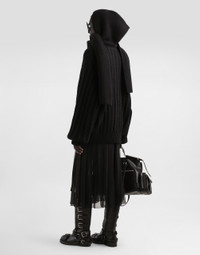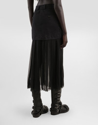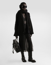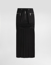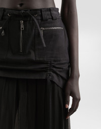 In the Fall/Winter 2025 Fashion Show Collection, shearling jackets, in fur-free versions, reveal slip dresses and create contrast' plays while denim welcomes fabric or Leo print inserts. Sweatshirts are the result of long experimentation with volumes. Evening looks become precious thanks to dresses with special embroideries and luminous touches of sequins and crystals. Sheepskin inserts also unite hats, shoes, and bags, including those with pockets. This skirt is an example of modern elegance, combining fine fabrics and innovative details. Perfect for those looking for a versatile and fashionable garment. Twill midi skirt with chiffon: • Black • With twill basque and patch pockets • Visible zippers • Single-profile pockets with buttonhole and button fastening • Visible zipper opening in the center front with visible chain • 4.7 cm high belt with stitching and drawstring passage • Vertical drawstring motif in the bottom • Length skirt including belt 85 cm on size 40 IT • The model is 175 cm tall and wears size 40 IT • Made in Italy External Composition: 70% Silk, 28% Cotton, 2% Elastane