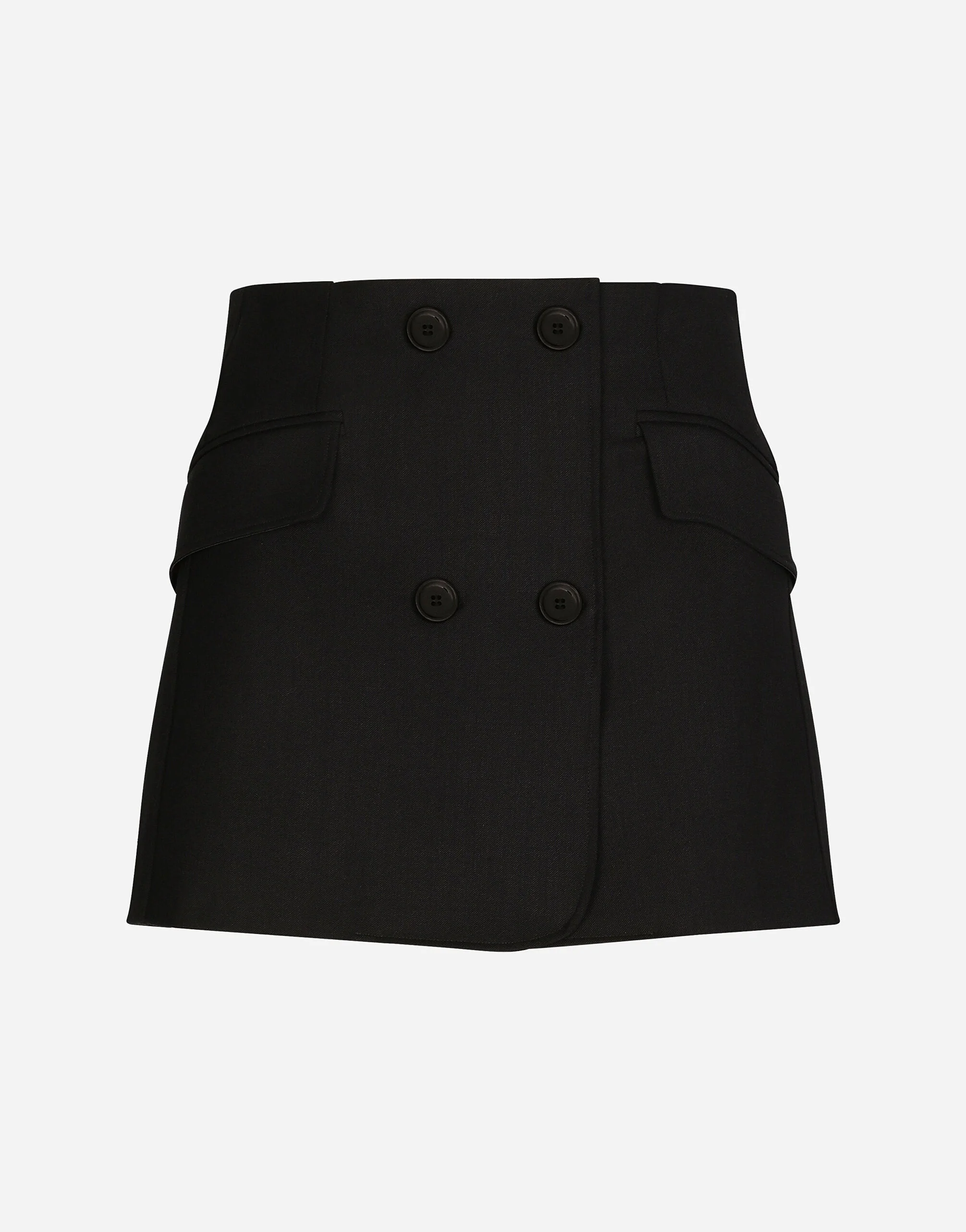 Stretch twill mini wrap skirt: • Black • Low rise • Faux flap pocket • Branded stretch satin jacquard lining • Rear zipper and hook-and-eye fastening • The piece measures 38 cm from the waist down on a size IT 40 • The model is 175 cm tall and wears a size IT 40 • Made in Italy Care And Details External composition: 97% Wool 3% Spandex Internal composition: 62% Polyester 35% Polyamide 3% Spandex