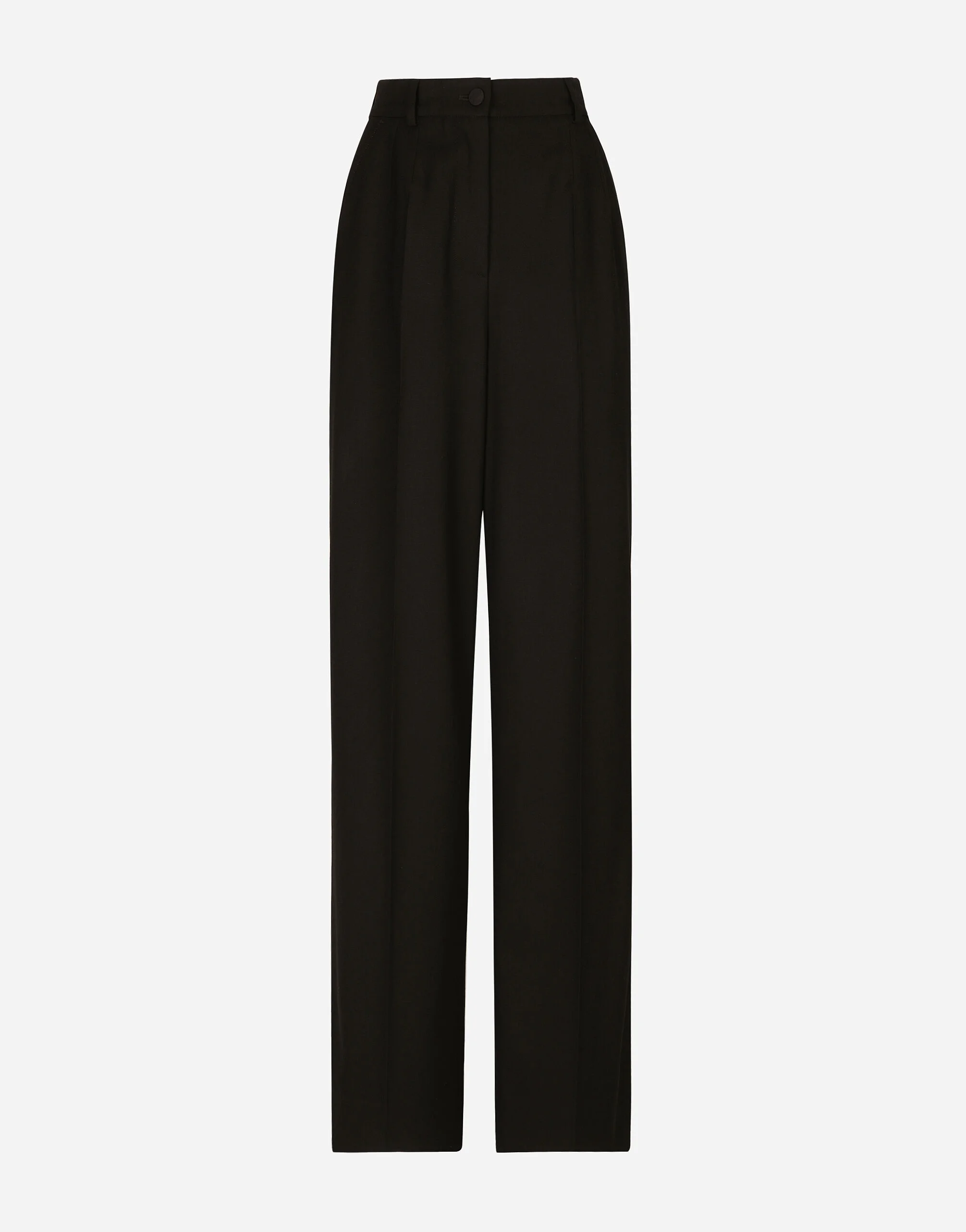 The DNA collection is distinguished by timeless shapes, bringing together three concepts: Sicilian flair, tailoring and sensuality. Nero Sicilia black and optical white predominate and pair with colors that catapult us onto the island of Sicily and make us dream. The designers channel the timeless wardrobe made up of creations that are instantly unmistakable in their simplicity, presenting us with sophisticated beauty loaded with meaning and symbolism that transcends fashion. Stretch wool twill palazzo pants: • Black • Dolce high waist • Slant front pockets • Welt pockets with button • Belt loops • Inner leg: 89 cm • Hem: 30 cm • Zipper and canneté-covered button and the DG logo on the back • The model is 175 cm tall and wears a size IT 40 • Made in Italy External composition: 96% Virgin Wool 4% Spandex