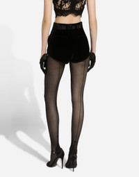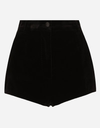 Menswear and womenswear mix and mingle, influencing one another and creating tailoring that embraces endless nuances, from the boldest to the most sophisticated, to define the rules of eternally classy femininity. A monochrome retelling in Nero Sicilia black, embellished by golden touches and rhinestones, adorning clean lines and incorporating stylish fabrics such as velvet, chiffon, lace, organza, and unique mesh details, the expression of authentic beauty for dresses, shirts and accessories. Cotton velvet high-waisted tuxedo panties: • Black • High-waisted • Slant pockets • Front zipper fastening and button • The model is 175 cm tall and wears a size IT 40 • Made in Italy External composition: 90% Cotton 08% Silk 02% Polyester