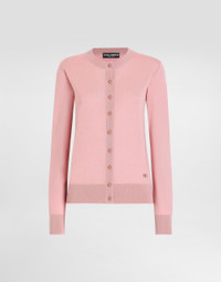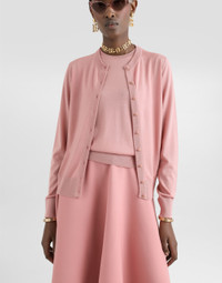 The Women’s DNA Collection is introducing a new side to femininity, which comes in shades of rose quartz, poised between sheerness and opacity, lightness and structure, formality and sensuality. Geometric Dolce Jackets, jacquard pajamas and floral brocade dresses intertwine with ultra-romantic designs. The DG print becomes an iconic statement, while Cordonetto lace and hints of Sicily Black embody the essence of a determined yet romantic femininity. Wool cardigan with DG logo embroidery: • Pink • 18-gauge knit • Round neck • Long sleeves • French seam armholes • Dense hand • Ribbed neck and hem • Regular fit • Button fastenings • The piece measures 60 cm from the shoulder seam on a size IT 40 • The model is 175 cm tall and wears a size IT 40 • Made in Italy External composition: 100% Virgin Wool