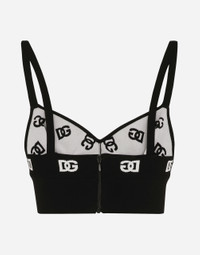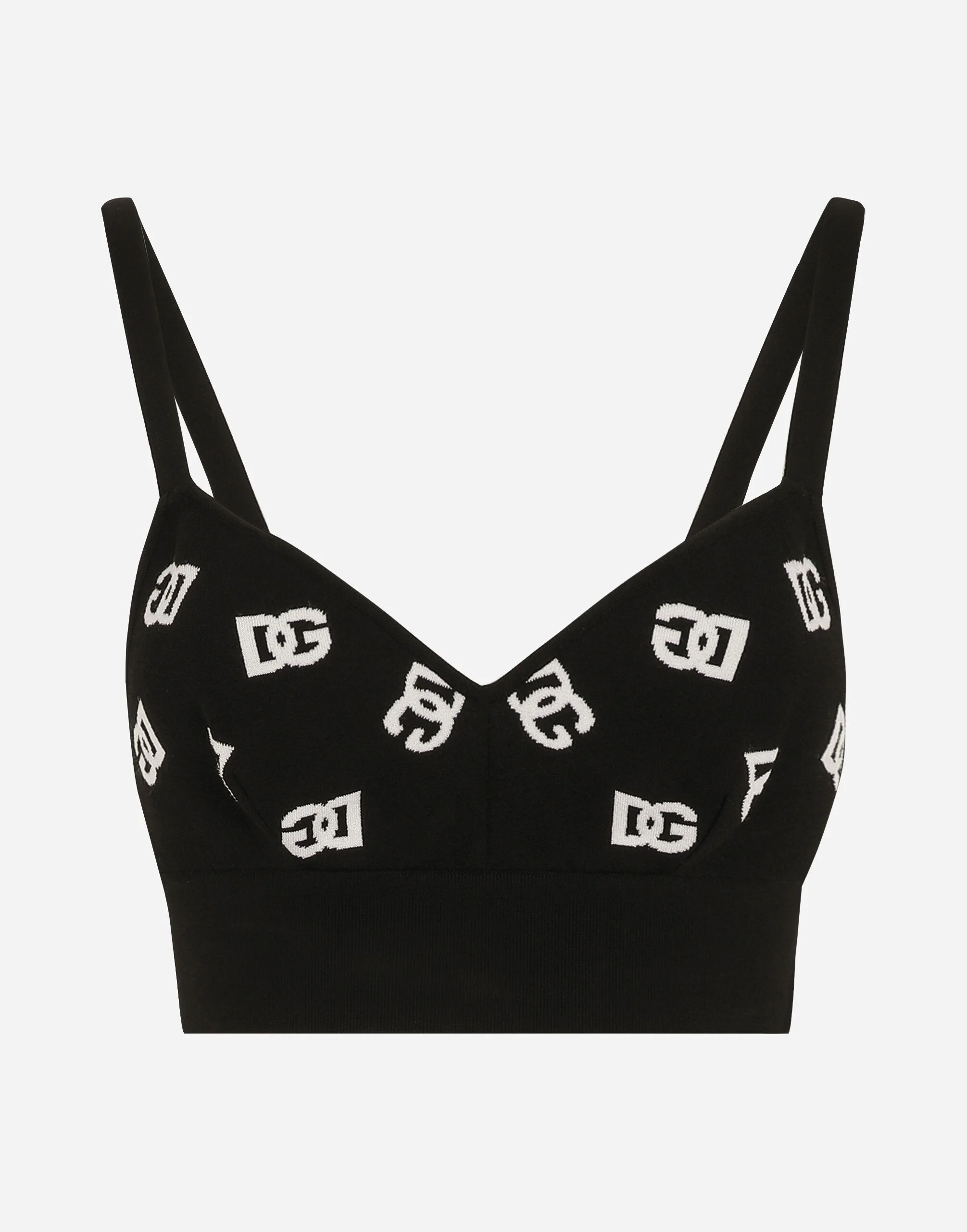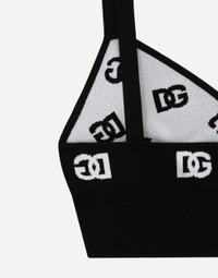 The DNA collection is distinguished by timeless shapes, bringing together three concepts: Sicilian flair, tailoring and sensuality. Nero Sicilia black and optical white predominate and pair with colors that catapult us onto the island of Sicily and make us dream. The designers channel the timeless wardrobe made up of creations that are instantly unmistakable in their simplicity, presenting us with sophisticated beauty loaded with meaning and symbolism that transcends fashion. Viscose bralette top with jacquard DG logo: • Black • 18-gauge knit • V-neck • Rear zipper and hook-and-eye fastening • The model is 175 cm tall and wears a size IT 40 • Made in Italy External composition: 83% Viscose 17% Polyester