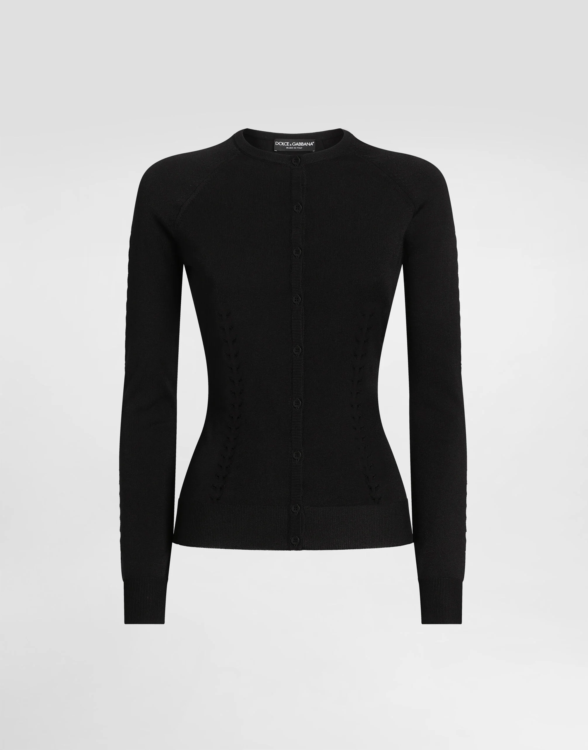 The Spring/Summer 2025 Women’s Collection is celebrating Italian beauty through bold and charismatic femininity. The 50s-inspired lingerie is the star, intermingling with fitted dresses, corsets and oversize trench coats. The iconic jackets have been updated with cropped cuts and modern inserts, while the floral prints add a romantic edge. The eveningwear shines with light fabrics and crystals, accompanied by look-defining accessories, from iconic bags to the cross earrings. Viscose cardigan with stitch work: • Black • 18-gauge knit • Round neck • Long sleeves • Ribbed trim • Raglan cuts • Slim fit • Button fastenings • The piece measures 60 cm from the shoulder seam on a size IT 40 • The model is 175 cm tall and wears a size IT 40 • Made in Italy External composition: 79% Viscose 13% Polyamide 8% Polyester