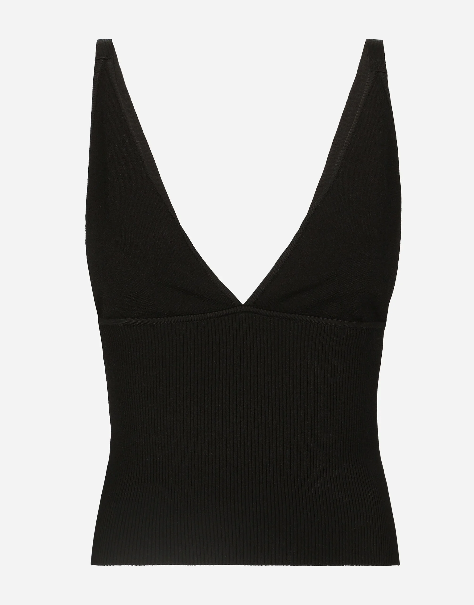 The FW24/25 Mambo Collection is rewriting the rules of Italian elegance, merging the sophisticated style of the 1940s and 1950s with the iconography of American pin-ups. The unmistakable polka-dot motif takes center stage, coming in a variety of shapes and sizes and adorning tulle, charmeuse, twill, silk and poplin, giving life to looks distinguished by black and white accessories and details. An homage to the beauty of Italy and its traditions, the distinctive details of Dolce&Gabbana’s creations. Viscose-knit vest top: • Black • 14-gauge knit • V-neck • Sleeveless • Cropped fit • The piece measures 45 cm from the shoulder seam on a size IT 40 • The model is 175 cm tall and wears a size IT 40 • Made in Italy External composition: 71% Viscose 15% Polyester 8% Polyamide 6% Spandex