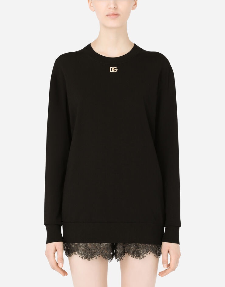 The intense and elegant Nero Sicilia black hue steals the scene on this viscose sweater featuring the metal DG logo with rhinestones. This elegant garment will add some character to your looks: • 18-gauge knit • Round neck • Long sleeves • Regular fit • Fine-rib trims • The piece measures 66 cm - 26 inches from the collar seam on a size IT 40 • The model is 175 cm - 68.9 inches tall and wears a size IT 40 • Made in Italy Care And Details External composition: 83% Viscose 17% Polyester