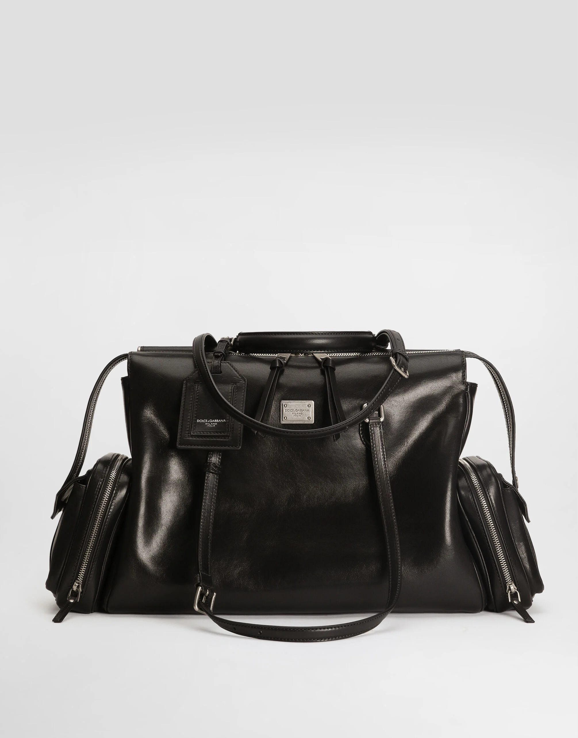In the Fall/Winter 2025 Fashion Show Collection, shearling jackets, in fur-free versions, reveal slip dresses and create contrast' plays while denim welcomes fabric or Leo print inserts. Sweatshirts are the result of long experimentation with volumes. Evening looks become precious thanks to dresses with special embroideries and luminous touches of sequins and crystals. Sheepskin inserts also unite hats, shoes, and bags, including those with pockets. The Vittoria shoulder bag, crafted from Calfskin with Miami palladium plating, is a classy accessory that combines functionality and style. Vittoria Calfskin bag: • Black • Leather handles • Zip closure • Miami palladium plating • External customization with monogalvanic plate • Internal customization with stamp with film • Interior with zip pocket and flat pocket • Item equipped with a logo bag • Measurements: H29.5 x W54 x D15.5 cm • Can hold keys, card holder and phone • Made in Italy External Composition: 95% Calfskin, 5% PVC