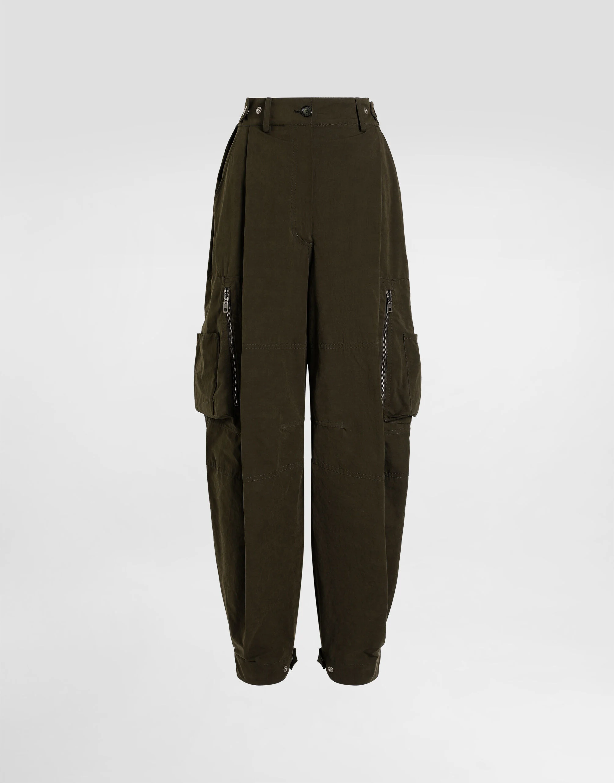 In the Fall/Winter 2025 Fashion Show Collection, shearling jackets, in fur-free versions, reveal slip dresses and create contrast' plays while denim welcomes fabric or Leo print inserts. Sweatshirts are the result of long experimentation with volumes. Evening looks become precious thanks to dresses with special embroideries and luminous touches of sequins and crystals. Sheepskin inserts also unite hats, shoes, and bags, including those with pockets. These waxed faille cargo trousers are the perfect expression of a casual and functional style, ideal for those looking for comfort without sacrificing a touch of originality. Waxed faille cargo pants: • Brown • Low waist • Pleat front and French pockets • Back pockets with flap • 5 cm high belt with internal elastic only at the back and toggles for adjustment • Toggles at the bottom of the leg for adjustment • The model is 175 cm tall and wears size 40 IT • Made in Italy External Composition: 45% Cotton, 39% Polyester, 16% Polyamide
