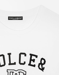Inspired by 80s fashion photography, the Black Sicily collection masterfully blends masculine and feminine elements, pairing tailored cuts and corset details for the FW 24/25 season. A new vision of the iconic Nero Sicilia black is conveyed through contemporary and sensual looks: jackets and skirts in all-over glen plaid pair with openwork socks, while the 50s-inspired Mun shoes with Eva heel go with the houndstooth Sicily bag featuring crocodile-print leather inserts. Cotton jersey T-shirt with Dolce&Gabbana logo embroidery and lettering: • White • Folded fine-rib round neck • Short sleeves • Regular fit • The piece measures 60 cm from the center back on a size IT 40 • The model is 175 cm tall and wears a size IT 40 • Made in Italy External composition: 100% Cotton