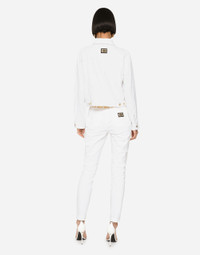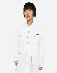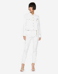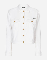 White denim jacket: • Shirt collar • Long sleeves • Branded metal and leather plate on the back • Regular fit • Flap pockets with branded metal button • Branded metal buttons on the front • The piece measures 49 cm from the rear collar seam on a size IT 40 • The model is 175 cm tall and wears a size IT 40 • Made in Italy The difference in the print placement that you may find on this product is a feature of Dolce&Gabbana’s “Handmade” pieces. A detail that makes every garment or accessory unique and exclusive. Care And Details External composition: 98% Cotton 2% Spandex