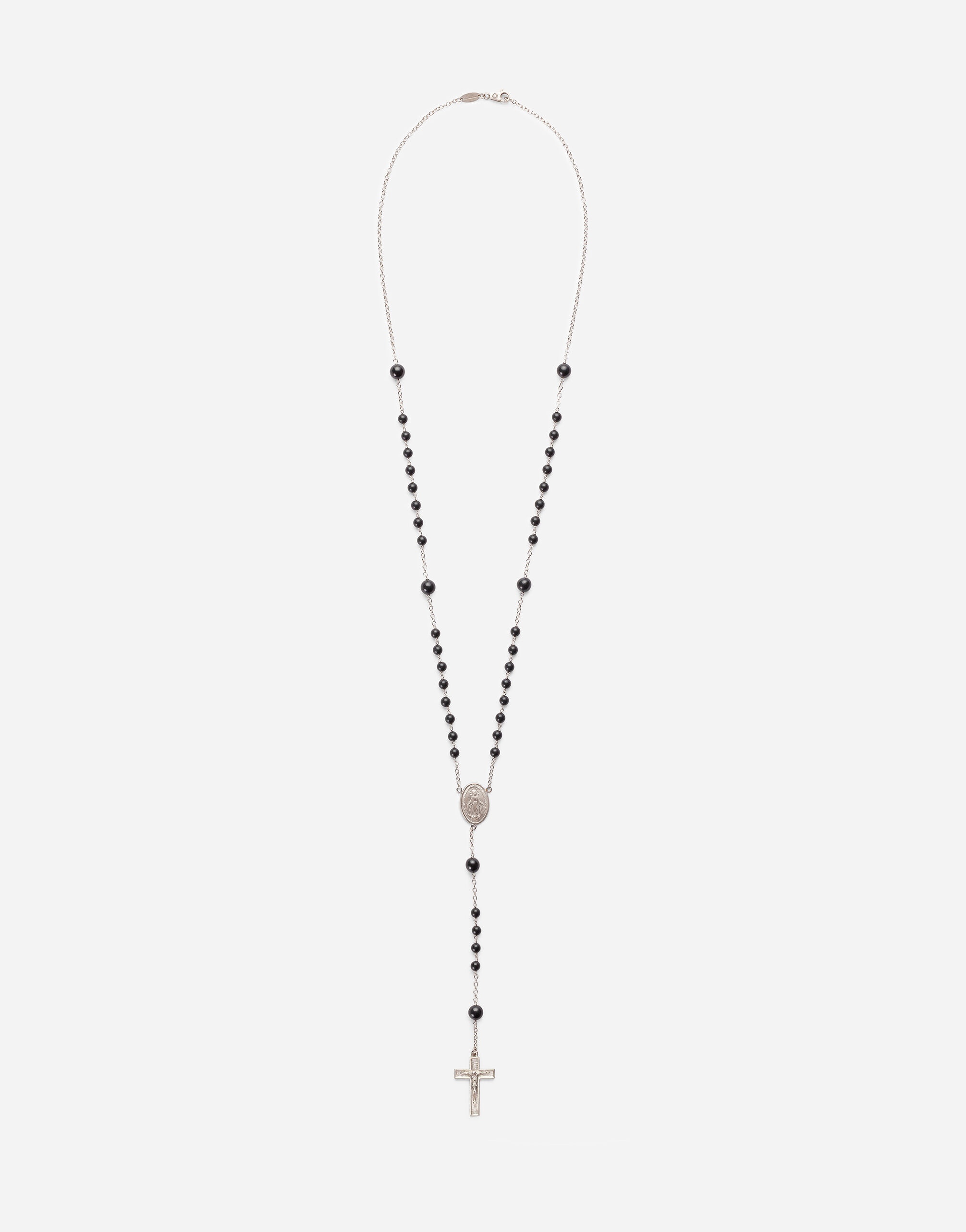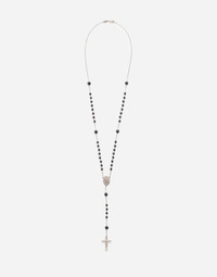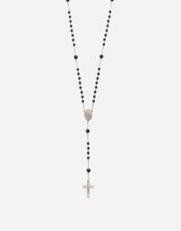 Rosary made up of forty-four black jade spheres with linked through weaving by hand. A white gold cross pendant with the DOLCE&GABBANA logo on the back is connected to the main wire by five black jade spheres and a medallion depicting the Madonna. A horn, symbol of superstition, has been added to the end of the adjustable chain. Technical specifications. • Gold 18 Kt. • Length. 40 + 2.5 + 2.5 cm adjustable. • Gemstones. 49 black jade spheres. External composition: White 18 kt Gold