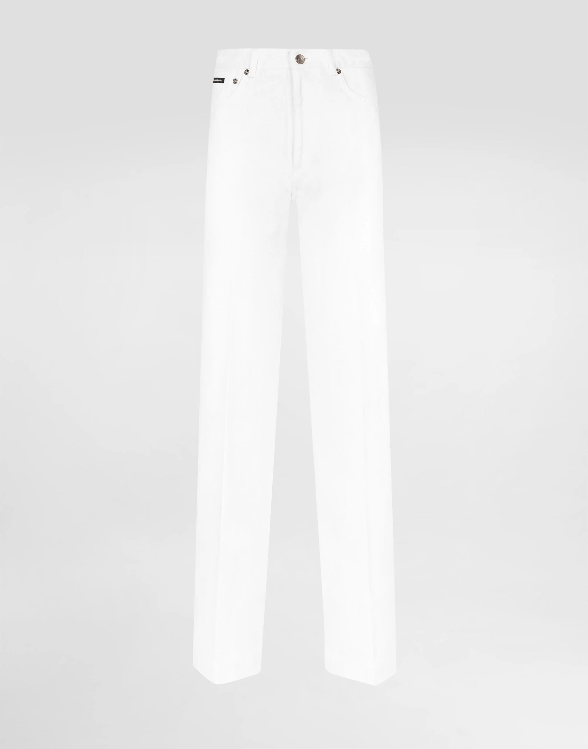 The Italian summers of the 1960s, the candid purity of white, the sophisticated elegance of the jet set of that era. The imagery of the FW24/25 Capri Collection encapsulates all this flawlessly. The pieces range from floaty poplin silhouettes or sack-style dresses and skirts, to brocade outerwear and floral-inlay fabric shirts. The iconic bags – the Logo Bag, the Sicily Bag and the Dolce Box – complement the looks, while the shoes come embroidered with designs inspired by the crystal-clear sea of Capri. Flared denim jeans: • White • High-waisted • 5 pockets • Branded label on the coin pocket • Branded metal and leather tag on the back pocket • Inner leg: 88 cm • Hem: 30 cm • Zipper and branded metal button fastening • The model is 175 cm tall and wears a size IT 40 • Made in Italy Composition: 100% Cotton