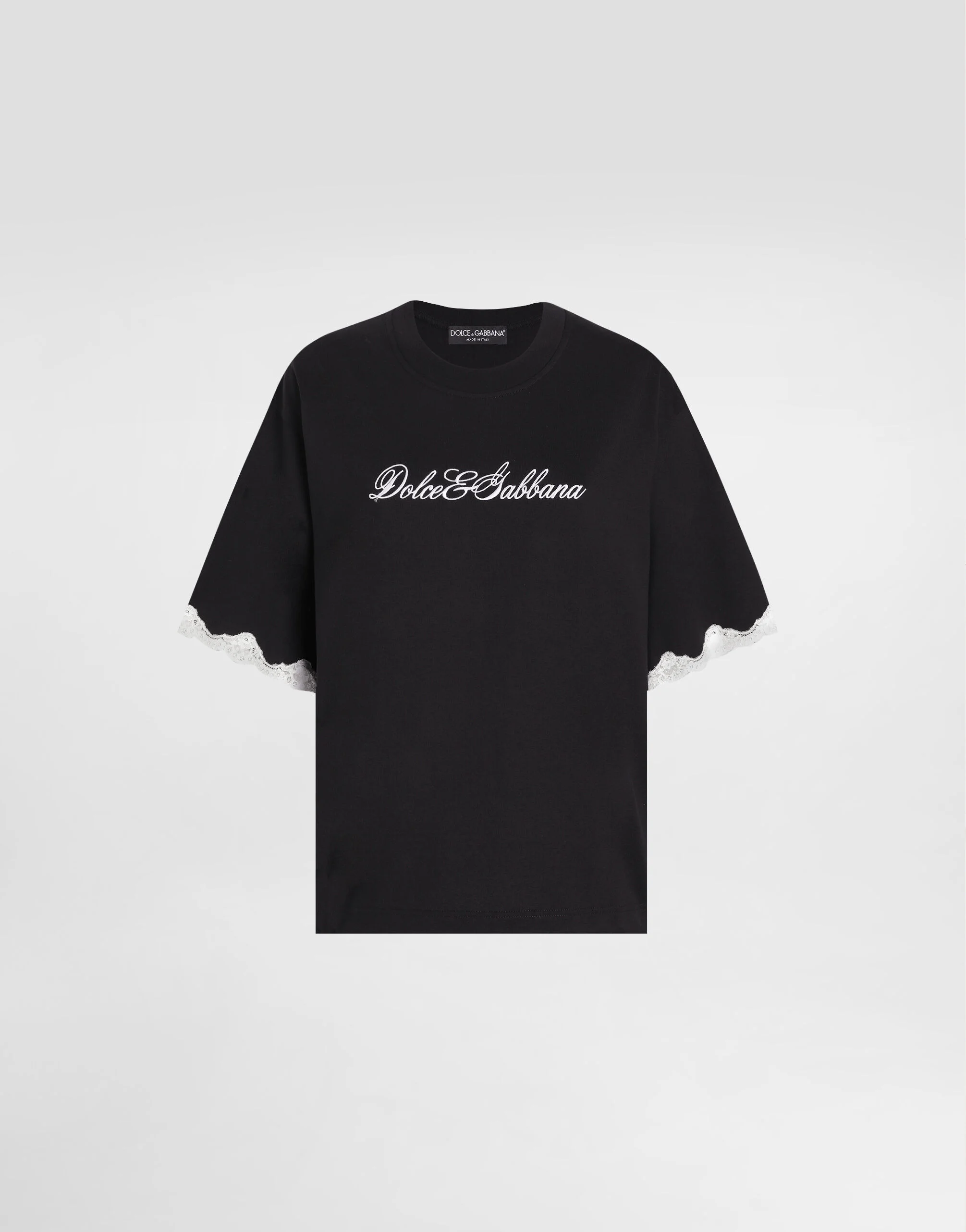 This classic t-shirt is a must-have in any woman's wardrobe, thanks to its simple yet elegant design, enhanced by refined details such as the embroidery on the front. Jersey t-shirt with embroidery: • Black • Short sleeves with lace at the bottom • The model is 175 cm tall and wears size 40 IT • Made in Italy External Composition: 99% Cotton, 1% Polyamide