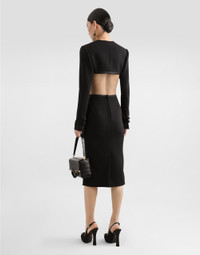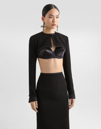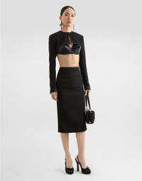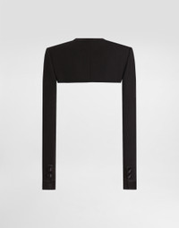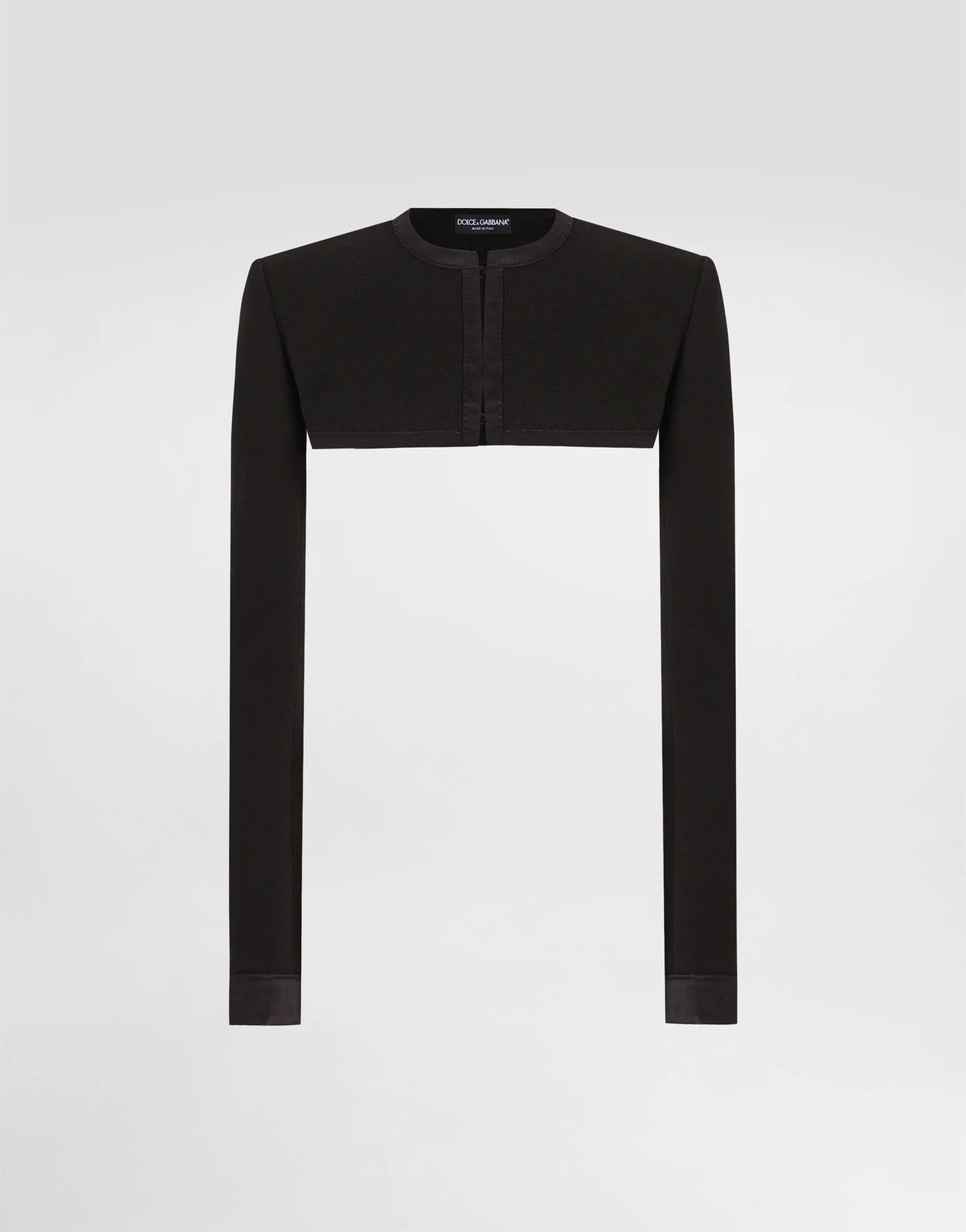 The Spring/Summer 2025 Women’s Collection is celebrating Italian beauty through bold and charismatic femininity. The 50s-inspired lingerie is the star, intermingling with fitted dresses, corsets and oversize trench coats. The iconic jackets have been updated with cropped cuts and modern inserts, while the floral prints add a romantic edge. The eveningwear shines with light fabrics and crystals, accompanied by look-defining accessories, from iconic bags to the cross earrings. Double stretch wool crepe shrug: • Black • Round neck • Long sleeves • Tulle lining • Hook-and-eye fastening • The piece measures 26 cm from the center back on a size IT 40 • The model is 175 cm tall and wears a size IT 40 • Made in Italy External composition: 83% Virgin Wool 11% Silk 3% Polyester 2% Polyamide 1% Spandex Internal composition: 90% Polyamide 7% Acetate 3% Silk
