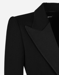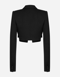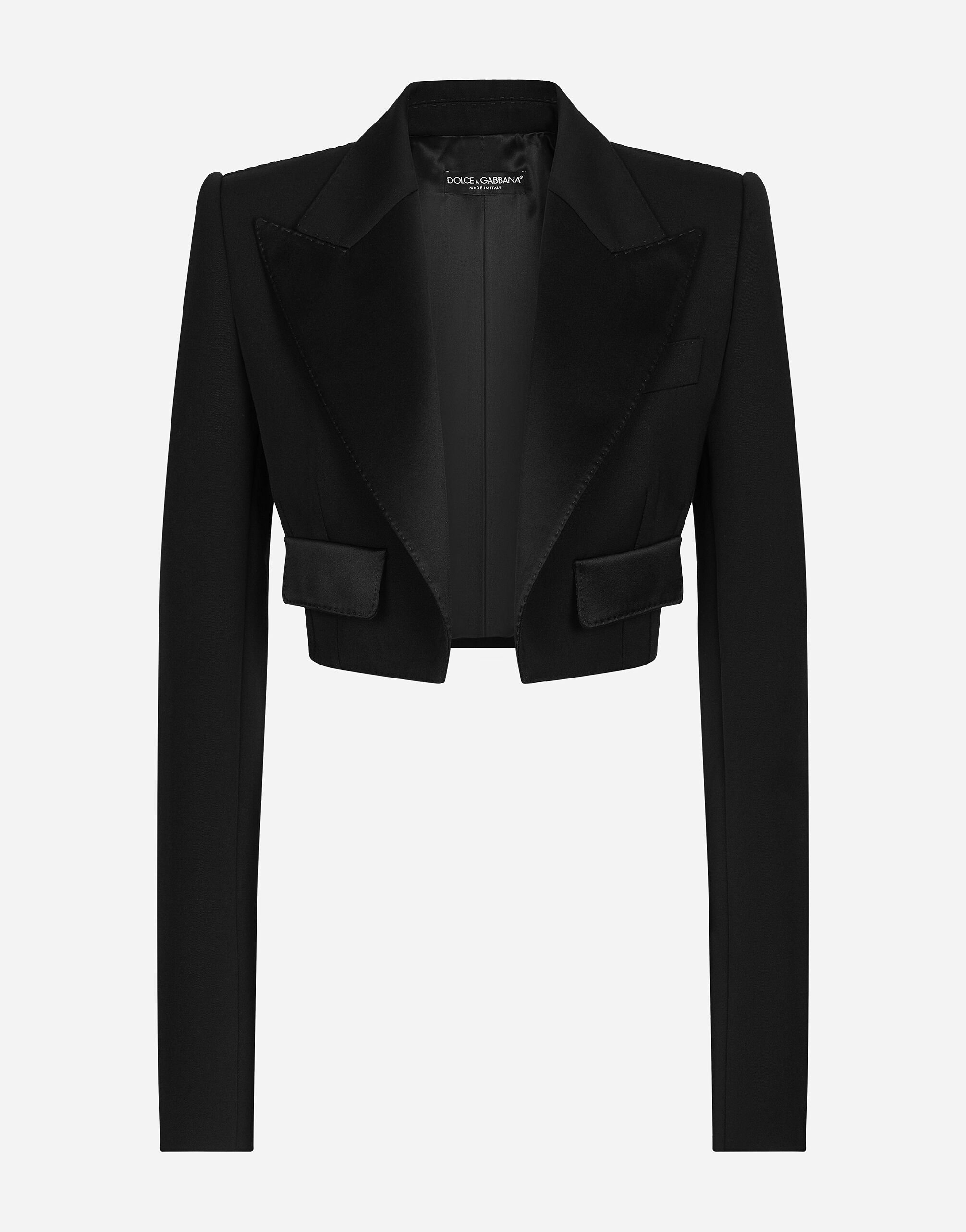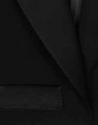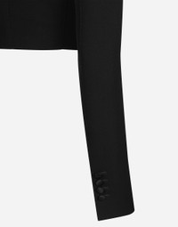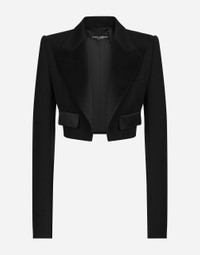 Menswear and womenswear mix and mingle, influencing one another and creating tailoring that embraces endless nuances, from the boldest to the most sophisticated, to define the rules of eternally classy femininity. A monochrome retelling in Nero Sicilia black, embellished by golden touches and rhinestones, adorning clean lines and incorporating stylish fabrics such as velvet, chiffon, lace, organza, and unique mesh details, the expression of authentic beauty for dresses, shirts and accessories. Short wool gabardine Spencer tuxedo jacket: • Black • Duchesse peak lapels • Long sleeves • Faux flap pockets • Silk satin lining • The piece measures 38 cm from the center back on a size IT 40 • The model is 175 cm tall and wears a size IT 40 • Made in Italy External composition: 88% Virgin Wool 10% Silk 02% Polyester Internal composition: 100% Silk
