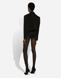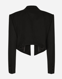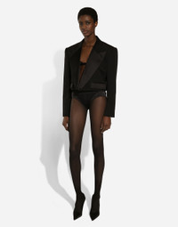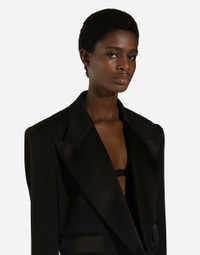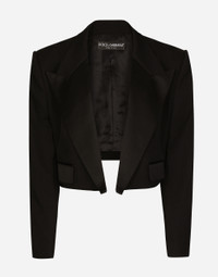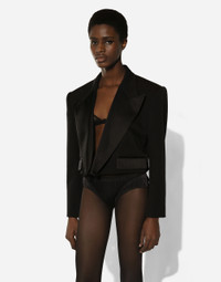 In the “WOMAN SS 24” Collection, the imagery of old Sicily interacts with the masculine, with sensual shapes, lace, nude tones and delicate overlays, to create pieces that move amid clean silhouettes, the elegance of the 1960s, the contrasts of black and white and luxurious textures. The designers are reworking their signature style and their iconic Sicilia black color to convey an aware, seductive and confident Sicilian WOMAN who is imbued with sensuality. Wool gabardine Spencer tuxedo jacket: • Black • Duchesse peak lapels • Long sleeves • Faux flap pockets • Silk satin lining • Button fastenings • The piece measures 42 cm from the center back on a size IT 40 • The model is 175 cm tall and wears a size IT 40 • Made in Italy External composition: 80% Virgin Wool 16% Silk 04% Polyester Internal composition: 100% Silk