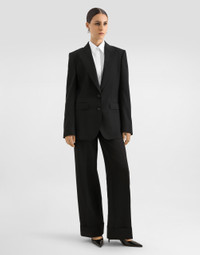 These wool gabardine trousers are the epitome of elegance and comfort, perfect for a sophisticated and timeless look. Wool gabardine trousers: • Black • Straight leg • Dolce waist • Two front pleats • French pockets • Double pleats at the back waist with welt pockets with buttonhole and button • 8 cm high turn-up hem • Inseam length 87 cm on size 40 IT • Leg opening 30 cm on size 40 IT • The model is 175 cm tall and wears size 40 IT • Made in Italy External Composition: 100% Virgin Wool