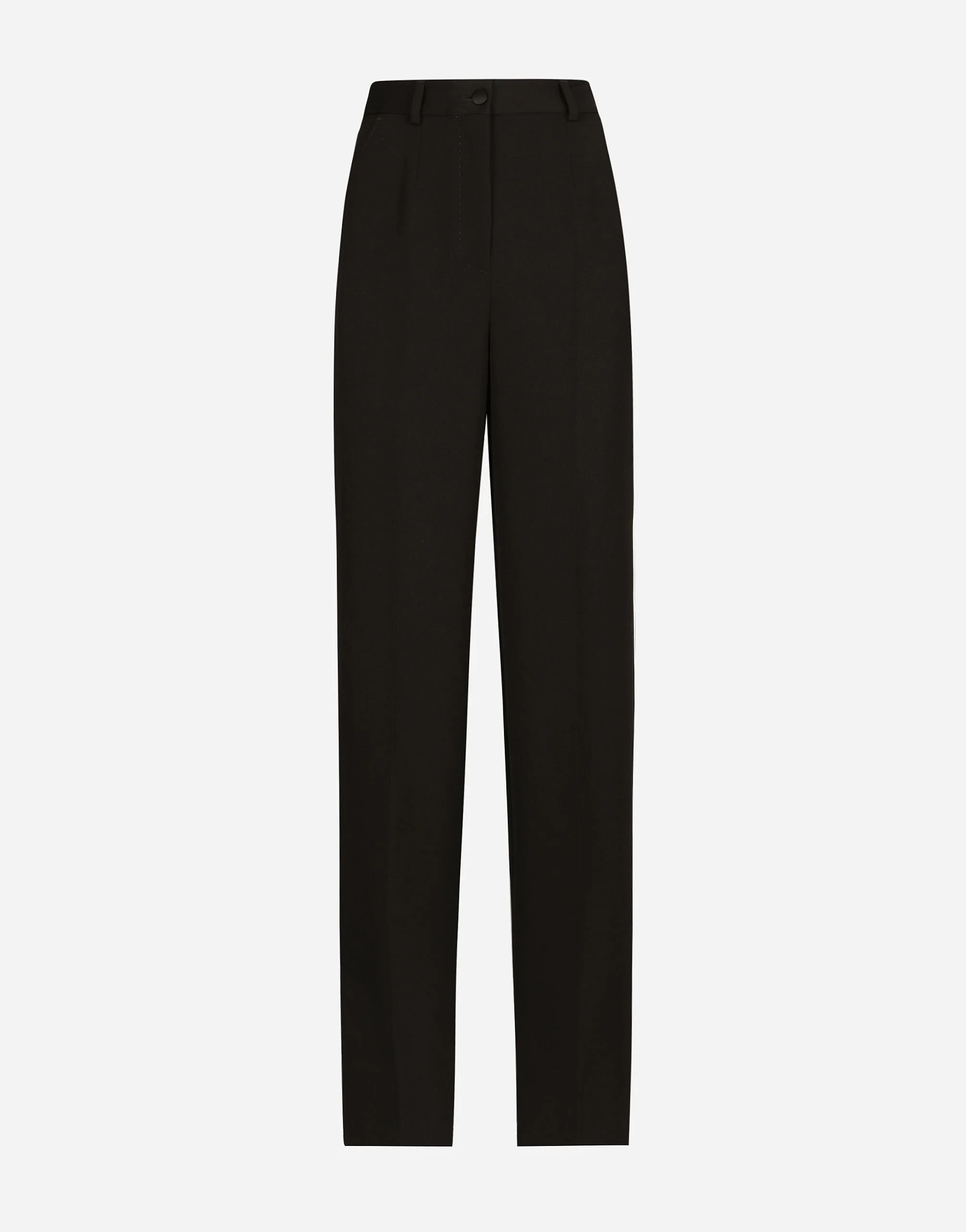 Menswear and womenswear mix and mingle, influencing one another and creating tailoring that embraces endless nuances, from the boldest to the most sophisticated, to define the rules of eternally classy femininity. A monochrome retelling in Nero Sicilia black, embellished by golden touches and rhinestones, adorning clean lines and incorporating stylish fabrics such as velvet, chiffon, lace, organza, and unique mesh details, the expression of authentic beauty for dresses, shirts and accessories. Wool gabardine tuxedo pants: • Black • High-waisted • Front slant pockets • Welt back pockets with buttons • Belt loops • Inner leg: 92 cm • Hem: 24 cm • Front zipper fastening and button • The model is 175 cm tall and wears a size IT 40 • Made in Italy External composition: 90% Virgin Wool 08% Silk 02% Polyester