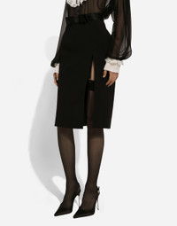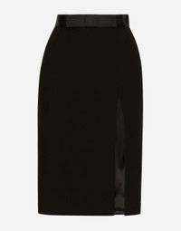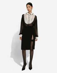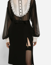 In the “WOMAN SS 24” Collection, the imagery of old Sicily interacts with the masculine, with sensual shapes, lace, nude tones and delicate overlays, to create pieces that move amid clean silhouettes, the elegance of the 1960s, the contrasts of black and white and luxurious textures. The designers are reworking their signature style and their iconic Sicilia black color to convey an aware, seductive and confident Sicilian WOMAN who is imbued with sensuality. Stretch wool midi pencil skirt with satin waistband: • Black • High-waisted with satin waistband • Stretch silk satin lining • Rear zipper and hook-and-eye fastening • The piece measures 60 cm from the waist down on a size IT 40 • The model is 175 cm tall and wears a size IT 40 • Made in Italy External composition: 60% Virgin Wool 37% Polyamide 03% Spandex Internal composition: 92% Silk 08% Spandex