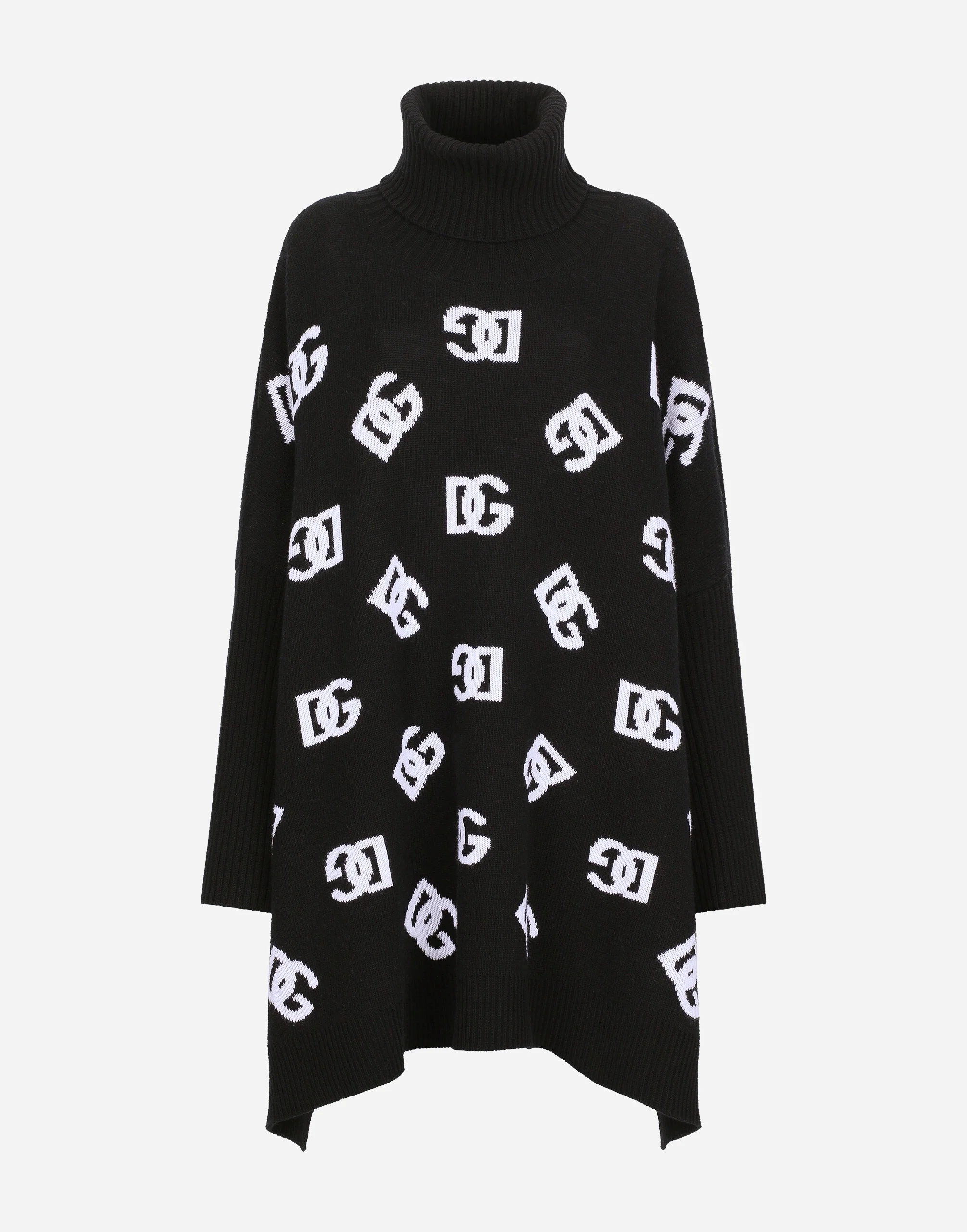 The DNA collection is distinguished by timeless shapes, bringing together three concepts: Sicilian flair, tailoring and sensuality. Nero Sicilia black and optical white predominate and pair with colors that catapult us onto the island of Sicily and make us dream. The designers channel the timeless wardrobe made up of creations that are instantly unmistakable in their simplicity, presenting us with sophisticated beauty loaded with meaning and symbolism that transcends fashion. Wool poncho with all-over jacquard DG logo: • Black • 12-gauge knit • Ribbed neck and sleeves • High neck • Long sleeves • Side slits • Oversize fit • The piece measures 80 cm from the shoulder seam on a size IT 40 • The model is 175 cm tall and wears a size IT 40 • Made in Italy External composition: 99% Virgin Wool 1% Polyamide