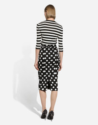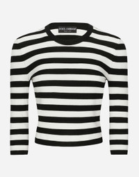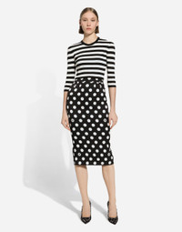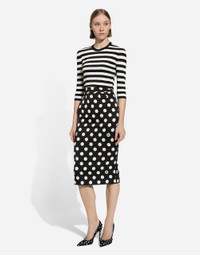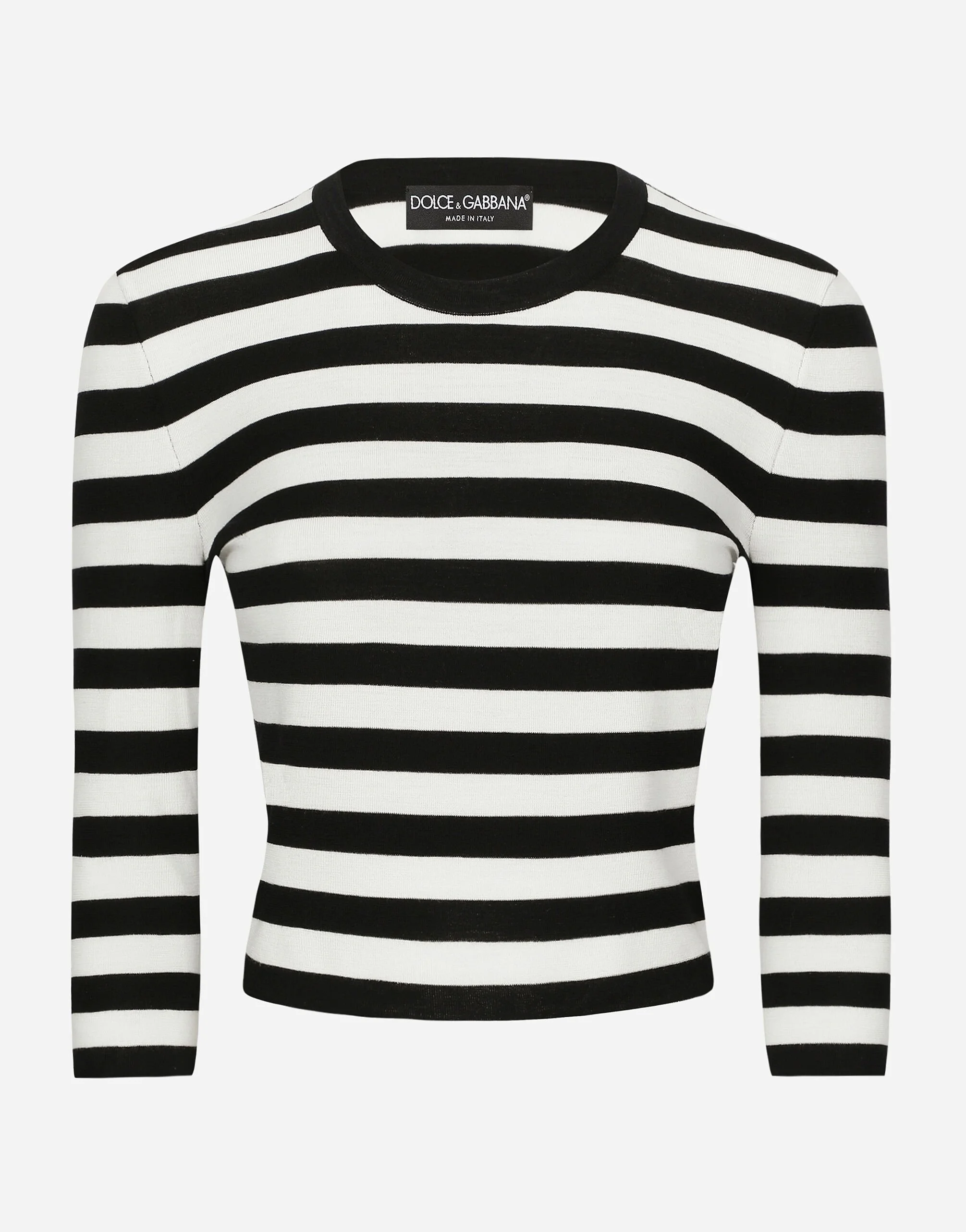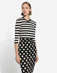 The FW24/25 Mambo Collection is rewriting the rules of Italian elegance, merging the sophisticated style of the 1940s and 1950s with the iconography of American pin-ups. The unmistakable polka-dot motif takes center stage, coming in a variety of shapes and sizes and adorning tulle, charmeuse, twill, silk and poplin, giving life to looks distinguished by black and white accessories and details. An homage to the beauty of Italy and its traditions, the distinctive details of Dolce&Gabbana’s creations. Wool sweater in inlaid stripes: • Multi-colored • 18-gauge knit • Round neck • 3/4 sleeves • Cropped fit • The piece measures 46 cm from the shoulder seam on a size IT 40 • The model is 175 cm tall and wears a size IT 40 • Made in Italy External composition: 100% Virgin Wool