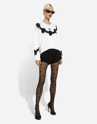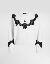 The DNA collection is distinguished by timeless shapes, bringing together three concepts: Sicilian flair, tailoring and sensuality. Nero Sicilia black and optical white predominate and pair with colors that catapult us onto the island of Sicily and make us dream. The designers channel the timeless wardrobe made up of creations that are instantly unmistakable in their simplicity, presenting us with sophisticated beauty loaded with meaning and symbolism that transcends fashion. Wool sweater with DG logo embroidery and lace inserts: • White • 7 and 3 gauge • DG embroidery • Round neck • Long sleeves • Straight shoulders • Oversize fit • Ribbed neck, cuffs and hem • The piece measures 50 cm from the shoulder seam on a size IT 40 • The model is 175 cm tall and wears a size IT 40 • Made in Italy External composition: 83% Virgin Wool 14% Cotton 3% Polyamide