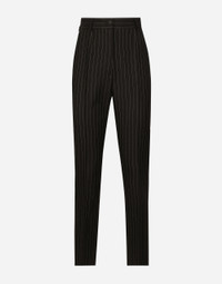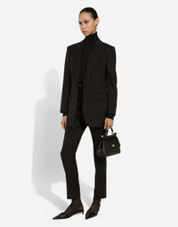 Inspired by 80s fashion photography, the Black Sicily collection masterfully blends masculine and feminine elements, pairing tailored cuts and corset details for the FW 24/25 season. A new vision of the iconic Nero Sicilia black is conveyed through contemporary and sensual looks: jackets and skirts in all-over glen plaid pair with openwork socks, while the 50s-inspired Mun shoes with Eva heel go with the houndstooth Sicily bag featuring crocodile-print leather inserts. Tailored pinstripe wool pants: • Black • Dolce high waist • Front slant pockets • Welt back pockets • Belt loops • Inner leg: 74 cm • Hem: 17 cm • Zipper and button fastening • The model is 175 cm tall and wears a size IT 40 • Made in Italy External composition: 100% Virgin Wool