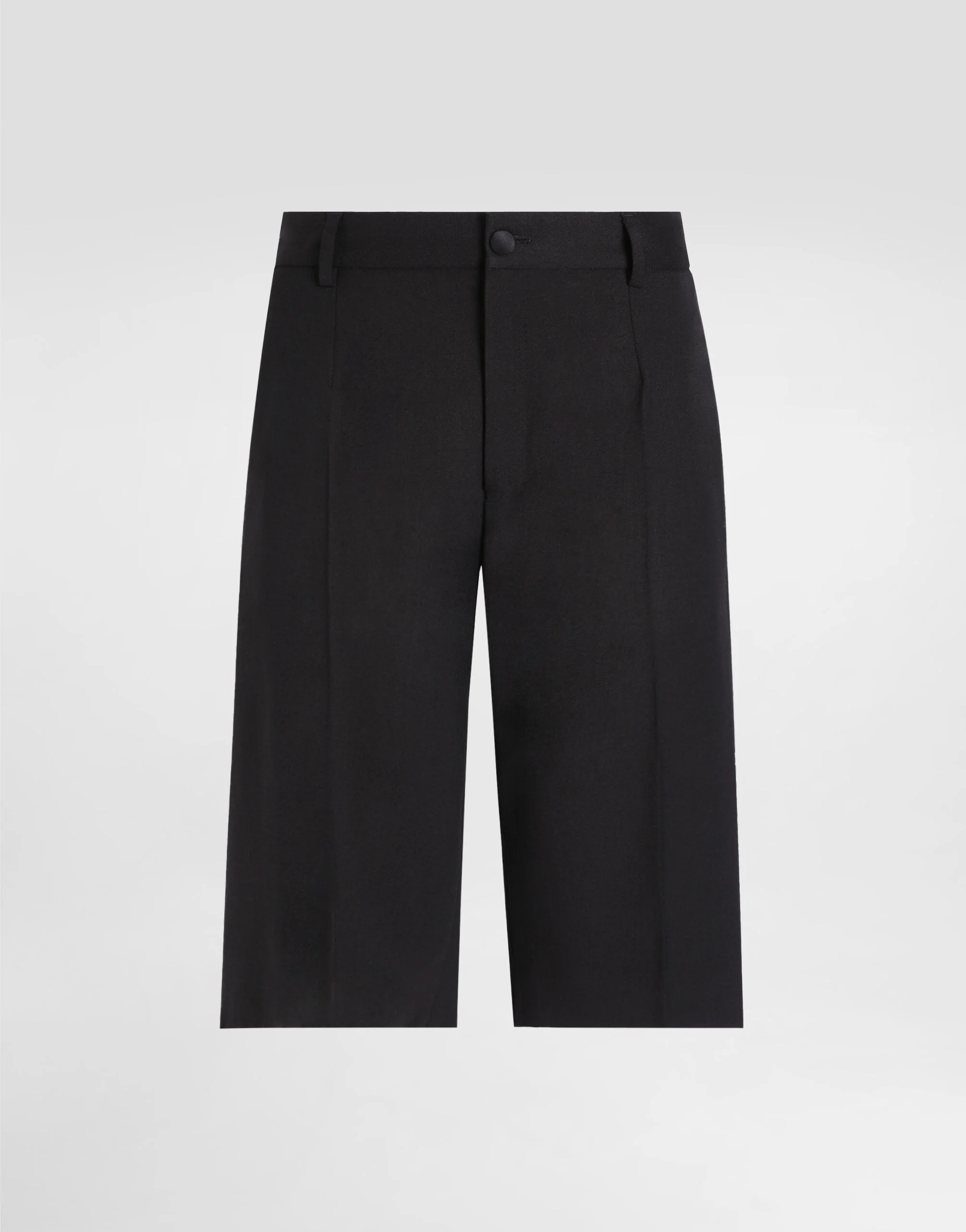 Gold and black: the iconic shades of Dolce&Gabbana color the Holiday Package Collection, capturing magnetic charm, timeless elegance, and sophisticated allure. Refined lines and exquisite details perfectly convey the magic of the festive season. Glossy, shimmering textures like lame jersey, thermostrass mesh, and sequins create looks that are sure to make a statement. Wool twill shorts: • Black • Regular rise • One dart • Front slant pockets • Welt back pockets • Inner leg: 34 cm • Hem: 27 cm • Zipper and button fastening • The model is 175 cm tall and wears a size IT 40 • Made in Italy External composition: 97% Wool 3% Spandex