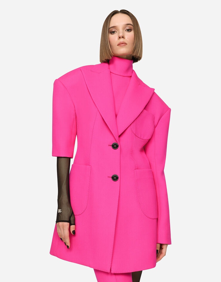 • Peak lapels • Long sleeves • Low shoulders • Patch pockets • Stretch silk satin lining • Branded Galalith button fastenings • The piece measures 83 cm from the rear collar seam on a size IT 40 • The model is 175 cm tall and wears a size IT 40 • Made in Italy Care And Details External composition: 66% Virgin Wool 29% Polyamide 5% Silk Internal composition: 92% Silk 8% Spandex