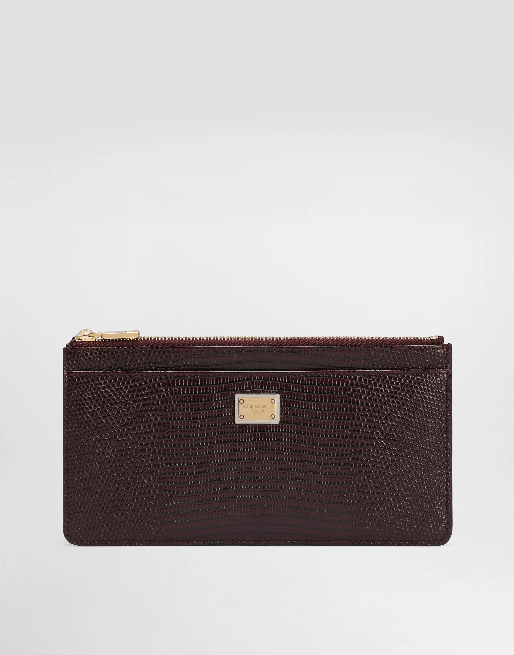 This iguana-print leather card holder is the ideal accessory for those looking for elegance and practicality, enriched with exclusive details. Iguana-print leather card holder with plate: • Bordeaux • Zip closure • Light gold plating • External customization with bigalvanic plate • Internal customization with logoed flag label • Special processing • Item equipped with logo bag and a logoed box • Measurements: H9.7 x W18.5 x D1.5 cm • Made in Italy External Composition: 100% Calfskin Internal Composition: 100% Viscose This product is made with leather from tanneries certified according to environmental standards.