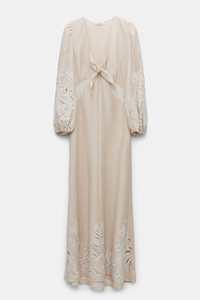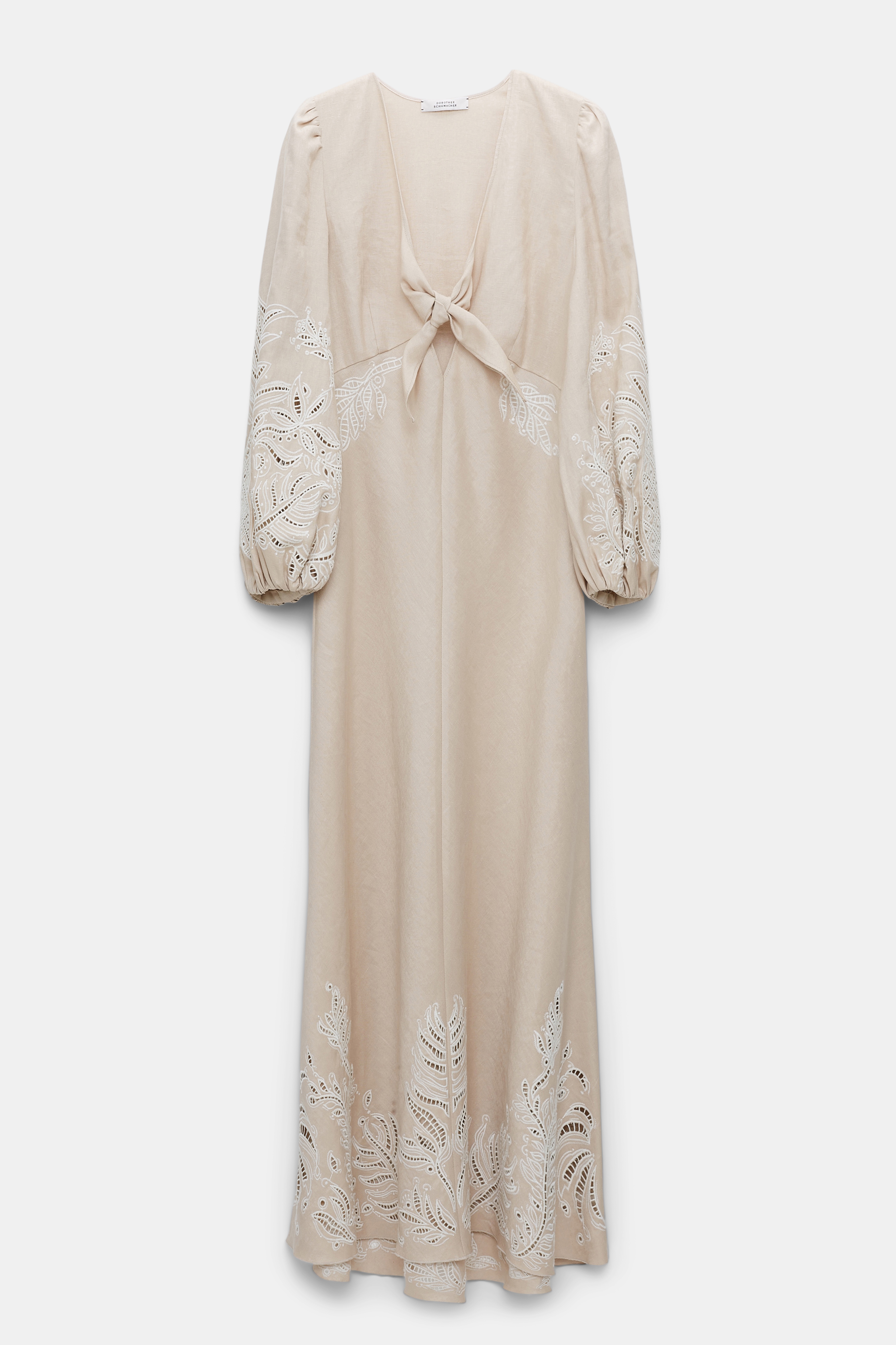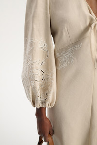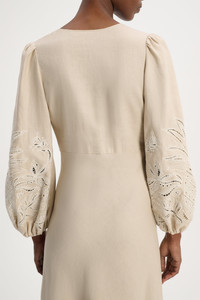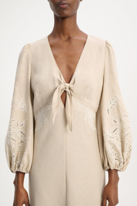 The linen midi dress has contrast broderie anglaise patterning and a deep V-neckline, which falls softly into a knotted tie. The long sleeve style has gathered cuffs. Material & Care - 100 % Linen - Linen midi dress with contrast broderie anglaise - Bias cut skirt - V-neckline with a knotted tie detail - WE CARE - The outer linen fabric has been certified with the EUROPEAN FLAX® label, which proves traceability at every step of linen processing - Dry cleaning only - No optical brighteners - Do not expose to extreme light - Shield from sharp items Size & Fit - Regular shoulders - Fitted