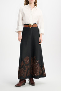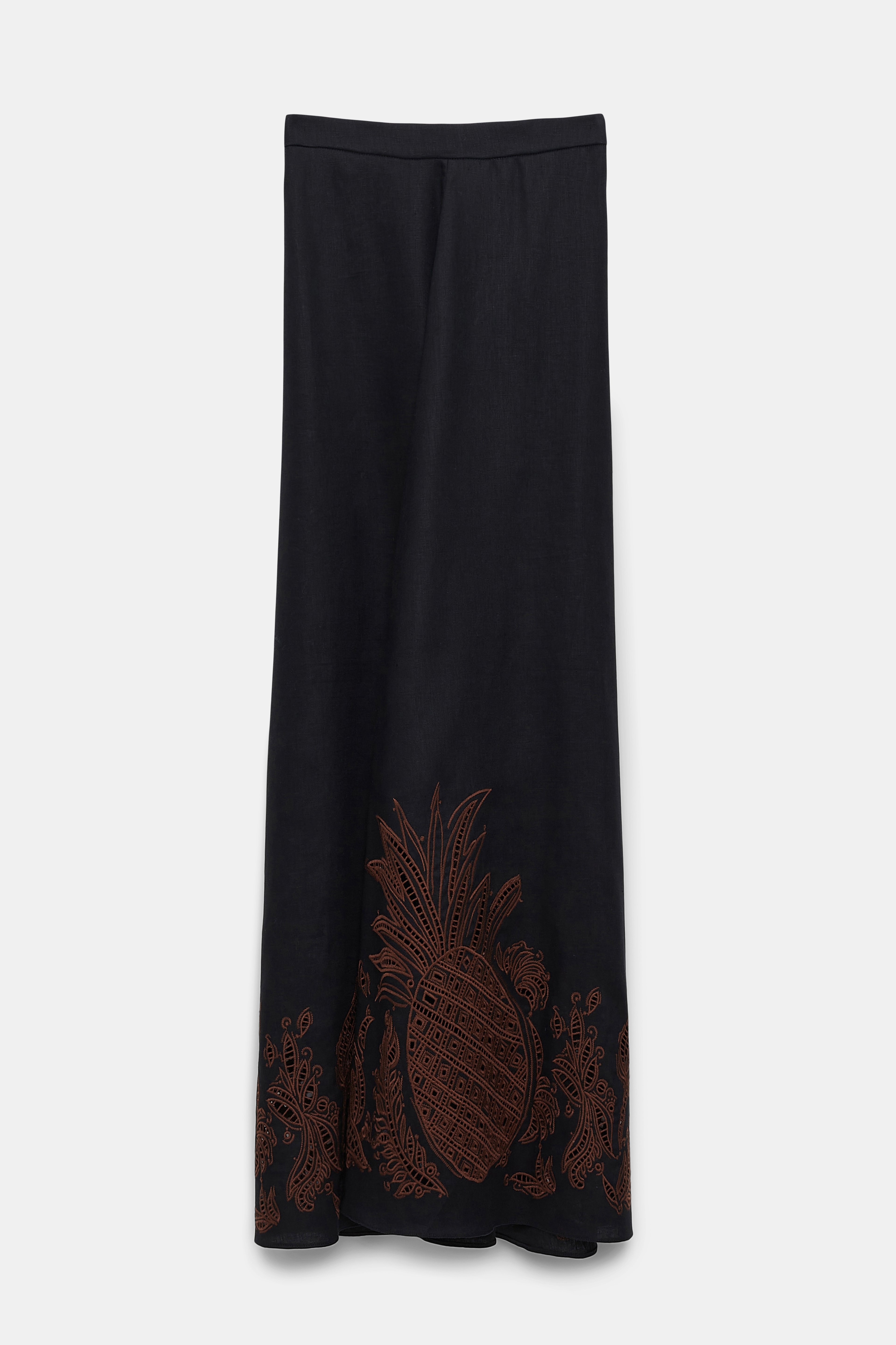The linen midi skirt has contrast broderie anglaise patterning and a slightly shorter draped front. Material & Care - 100 % Linen - Linen midi skirt with contrast broderie anglaise - Center back seam - In-seam back zip closure - WE CARE - The outer linen fabric has been certified with the EUROPEAN FLAX® label, which proves traceability at every step of linen processing - Dry cleaning only - No optical brighteners - Do not expose to extreme light - Shield from sharp items Size & Fit - Fitted