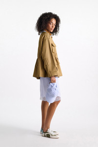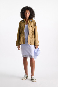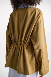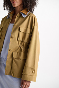 A modern remix of the classic field coat, the unlined cotton jacket has a slightly oversized silhouette and features a second, layered collar, which can be removed. The jacket has a drawstring waist and vents for breathability. Material & Care - 100 % Cotton - Cotton field jacket - Drawstring waist - Patch pockets - Removable double collar - Tabbed cuffs - Vents for breathability - Unlined - Dry cleaning only - No optical brighteners - Do not expose to extreme light - Shield from sharp items Size & Fit - Our model is 179cm tall and wears a size 2. - Slightly oversized - Adjustable with a drawstring cinch