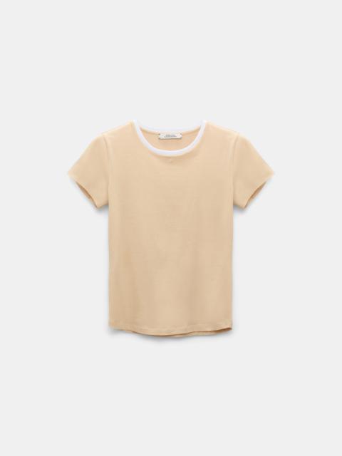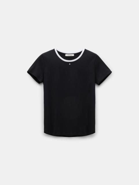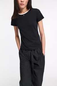 The T-shirt is made from a comfortable stretch cotton mix and has contrast white trim around the neckline. The fitted style features D-rose embellishment at the throat. Material & Care - 96 % Cotton, 4 % Elastane - Stretch cotton T-shirt with D-rose embellishment - Round neckline with white fine rib trim - Double layer sleeves - Double-needle stitching at the hem - Mild wash / Delicates - Wash with similar colors Size & Fit - Our model is 180cm tall and wears a size 2 - Fitted