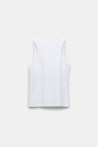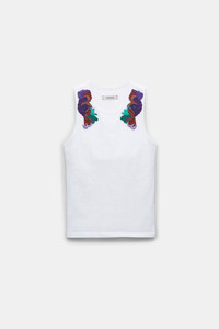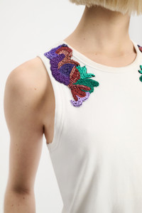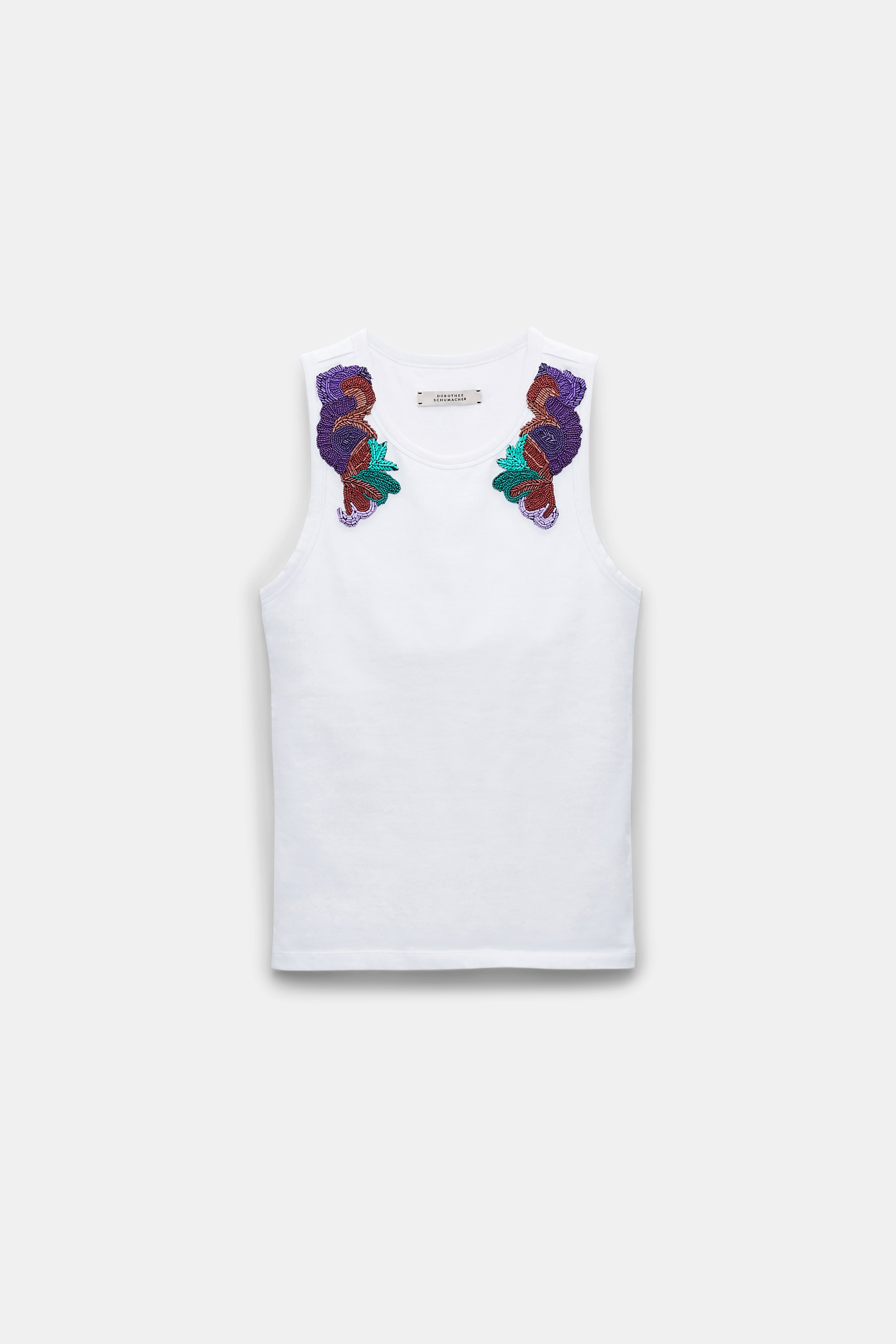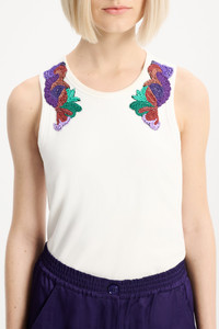 The round neck tank top is made of stretch cotton and has a built-in bra. The sleeveless style is dressed up with embroidered appliqué on the shoulders. Material & Care - 96 % Cotton, 4 % Elastane - Round neck tank top with built-in bra - Embroidered appliqué at the shoulders - Neckline and sleeve opening with double-needle topstitching - Double-needle topstitching on the hem Size & Fit - Fitted - This item runs small - we recommend choosing one size larger