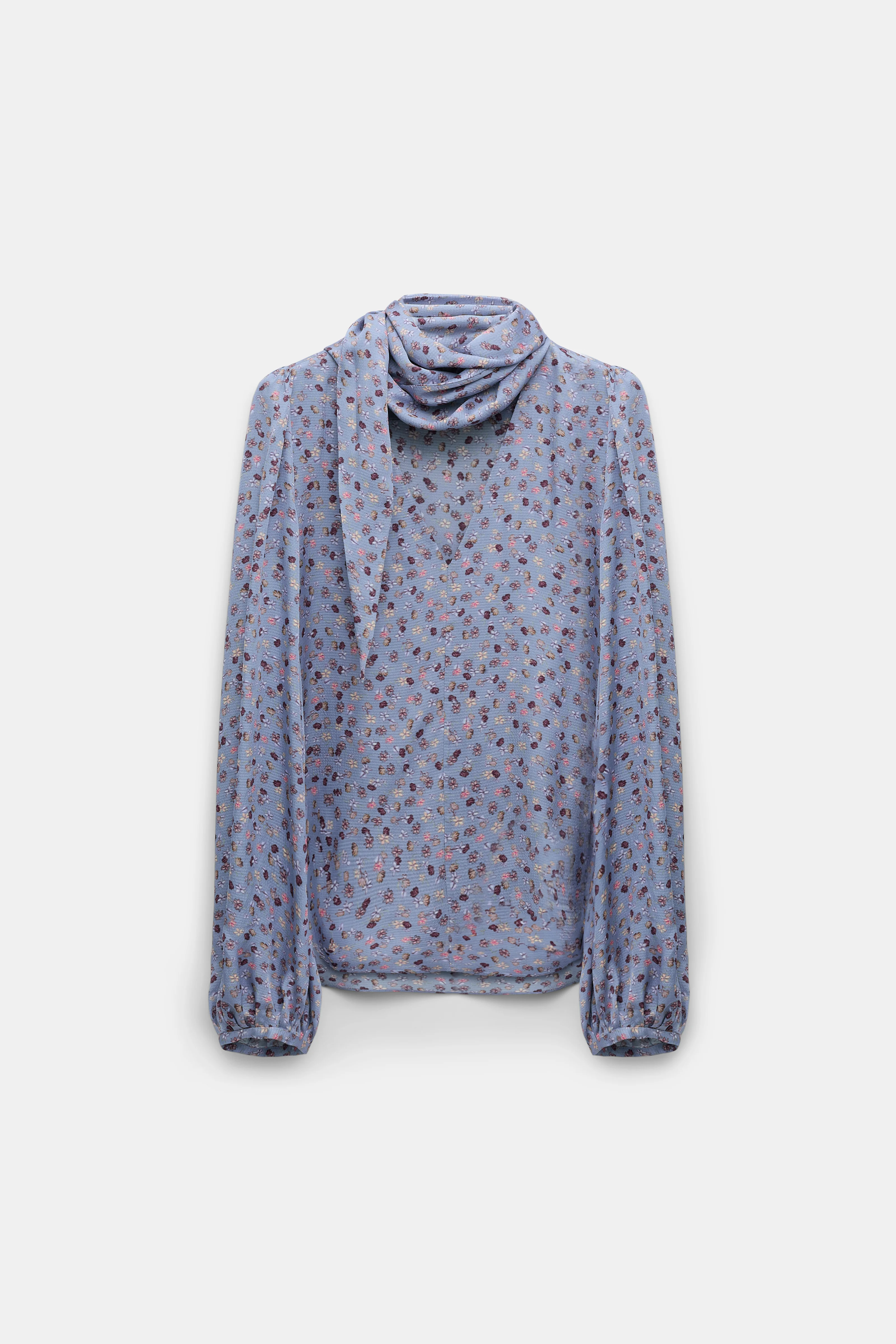 The micro print blouse is styled in hammered silk and has a V-neckline with wrap-around tie collar. The blouse has puff sleeves, which come to a gather at the cuffs. Material & Care - 100 % Viscose - Printed blouse in hammered satin - V-neckline with scarf detail - Gathered cuffs Size & Fit - Narrow shoulders - Puff sleeves