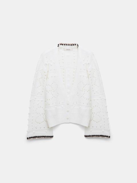 Let's talk details: The V-neck cardigan is knit in a cotton blend and has stitch and D-rose pointelle patterning. The relaxed fit style has contrast crochet trim on the neckline and cuffs. Material & Care - 64 % Cotton, 28 % Lyocell, 8 % Polyamide - Cotton blend V-neck cardigan - Mixed texture stitching and D-rose pointelle patterning in pure cotton - Contrast color crochet on the cuffs - Button closures Size & Fit - Our model is 178 cm tall and wears a size S - Relaxed fit - Straight, wide sleeves - Fitted hem
