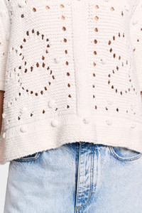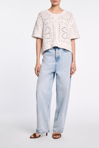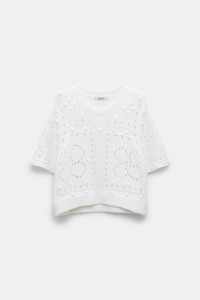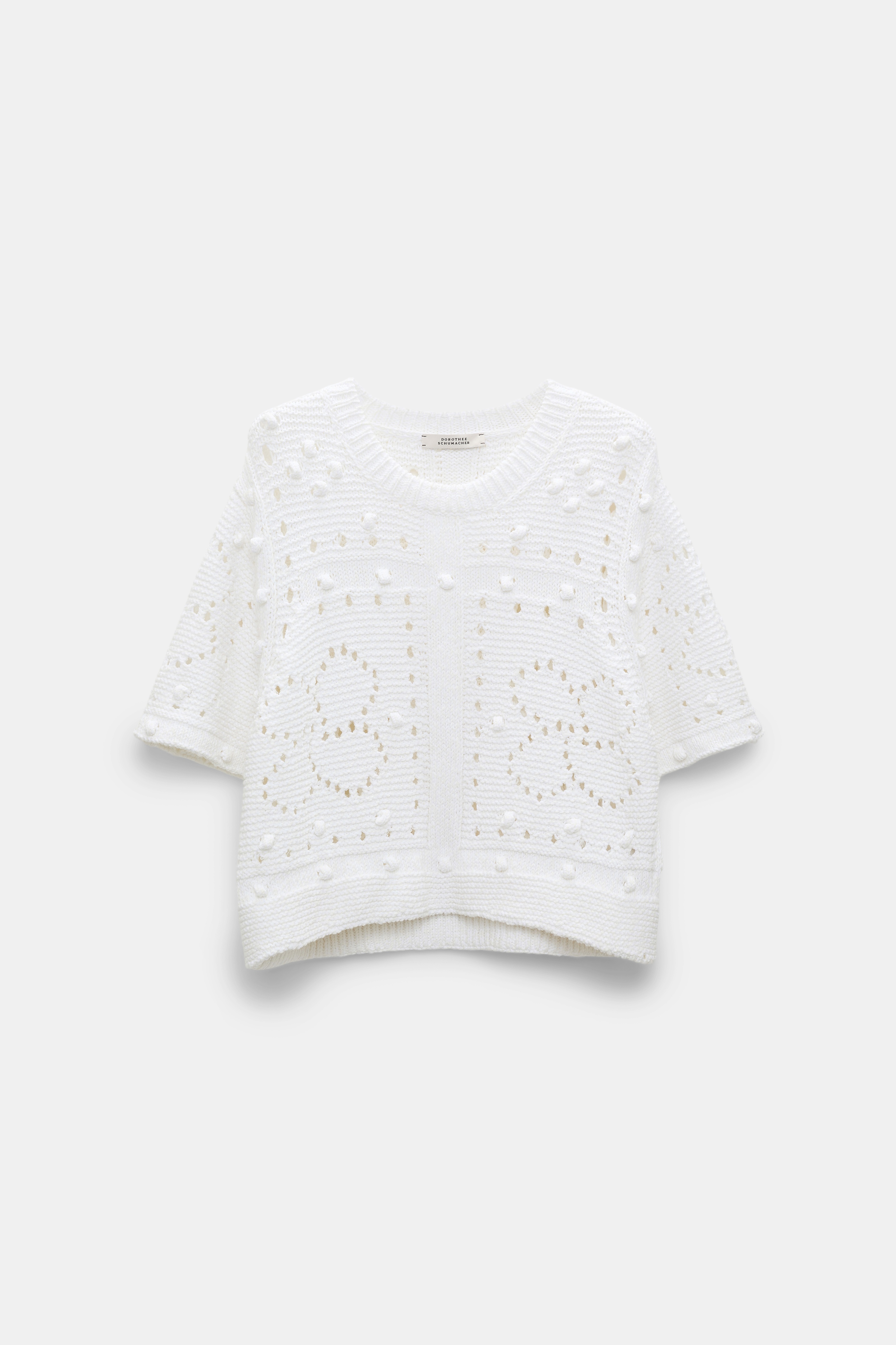 The round neck top is knit in a cotton blend and has stitch and D-rose pointelle patterning. The relaxed style has elbow-length sleeves. Material & Care - 64 % Cotton, 28 % Lyocell, 8 % Polyamide - Cotton blend round neck pullover - Mixed texture stitching and D-rose pointelle patterning in pure cotton Size & Fit - Our model is 178 cm tall and wears a size S - Relaxed fit - Straight, wide sleeves