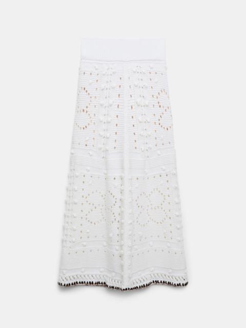 Let's talk details: The maxi skirt is knit in a cotton blend and has stitch and D-rose pointelle patterning. The ankle-grazing style has contrast crochet trim on the hemline. Material & Care - 65 % Cotton, 27 % Lyocell, 7 % Polyamide, 1 % Elastane - Cotton blend maxi skirt - Mixed texture stitching and D-rose pointelle patterning in pure cotton - Contrast color crochet trim - Slip lining Size & Fit - Fitted at the hips - Slight A-line flare