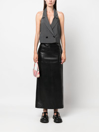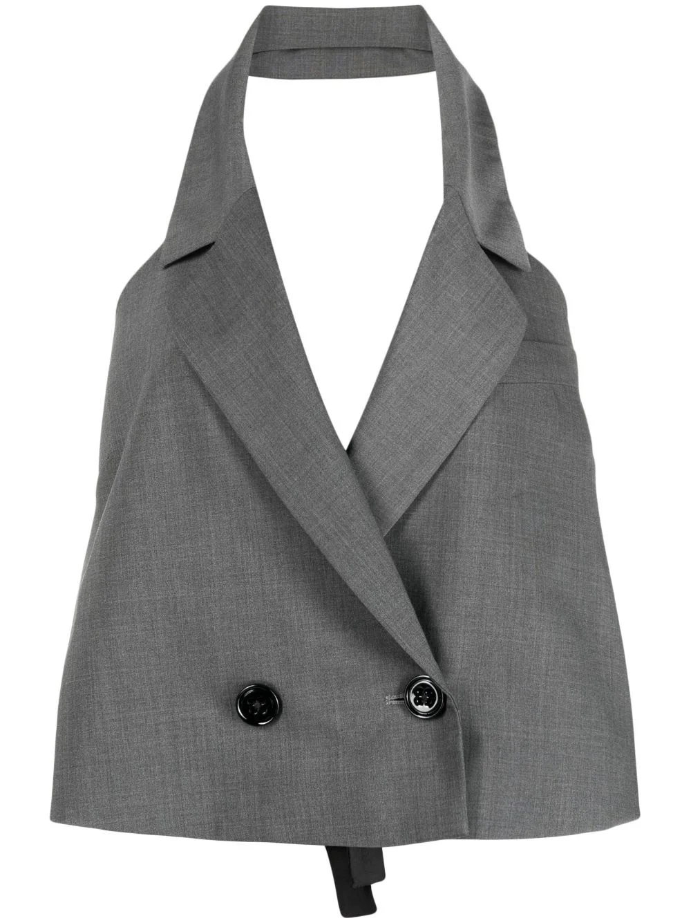 button-up halterneck waistcoat Highlights - Smoke grey - Virgin wool blend - Wide peak lapels - Halterneck - Plunging v-neck - Double-breasted button fastening - Chest welt pocket - Open back - Straight hem - Cropped Imported Composition Virgin Wool 96%, Elastane 4% SIZE & FIT Measurement LENGTH 21.25 in(54 cm) Washing instructions Dry Clean Only