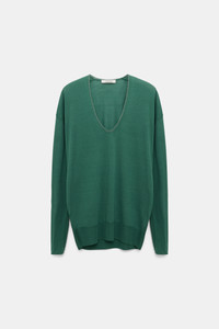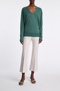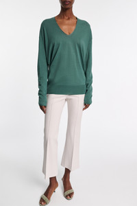 The pullover is knit in a wool-cotton blend and has a deep U-neckline. The sweater has a generous fit and falls to the hip. Material & Care - 49 % Virgin Wool, 46 % Cotton, 3 % Polyamide, 2 % Polyester - Wool-cotton blend pullover - Deep U-neckline - Neckline with tonal sheer yarn detailing - WE CARE - This item is finished according to STANDARD 100 by OEKO-TEX, 22.0.98928 Hohenstein HTTI - Hand wash cold / Machine wash cold - Wash with similar colors Size & Fit - Our model is 179cm tall and wears a size S - Generous fit - Falls to the hip - Dropped shoulders - Relaxed sleeves, fitted cuffs - Fitted hem